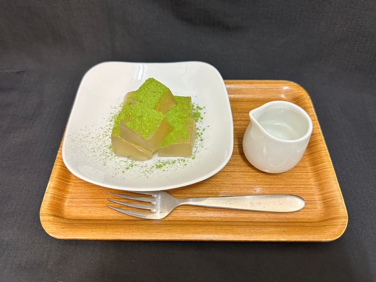 メニューに載っているわらび餅はきな粉と黒蜜なのですが、抹茶わらび餅は抹茶と白蜜でご提供しております。