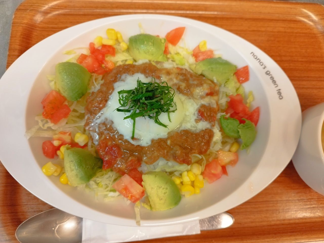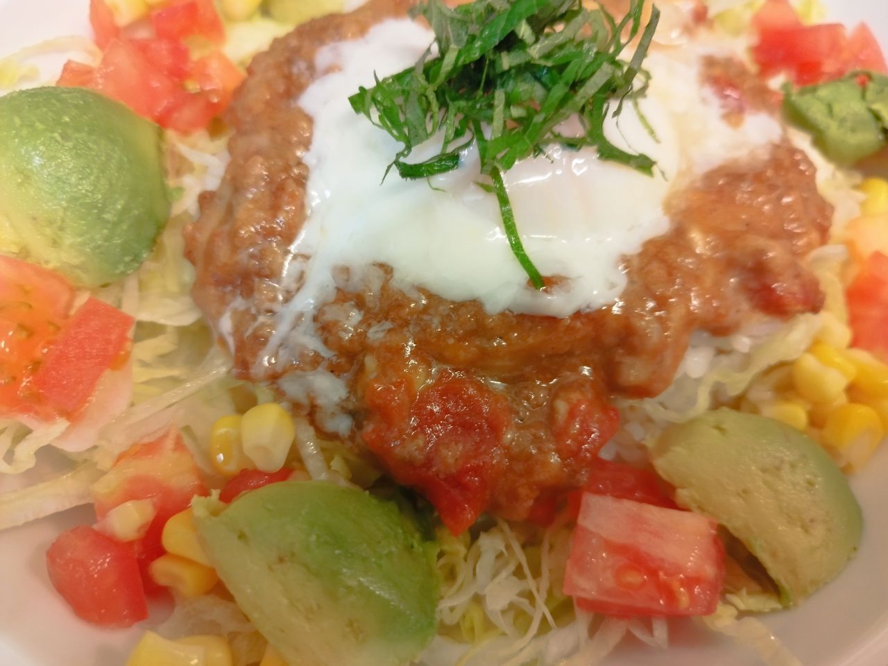 レタス、トマト、アボカド、コーンと約100グラムの野菜に濃厚なタコス、半熟卵をのせました。
