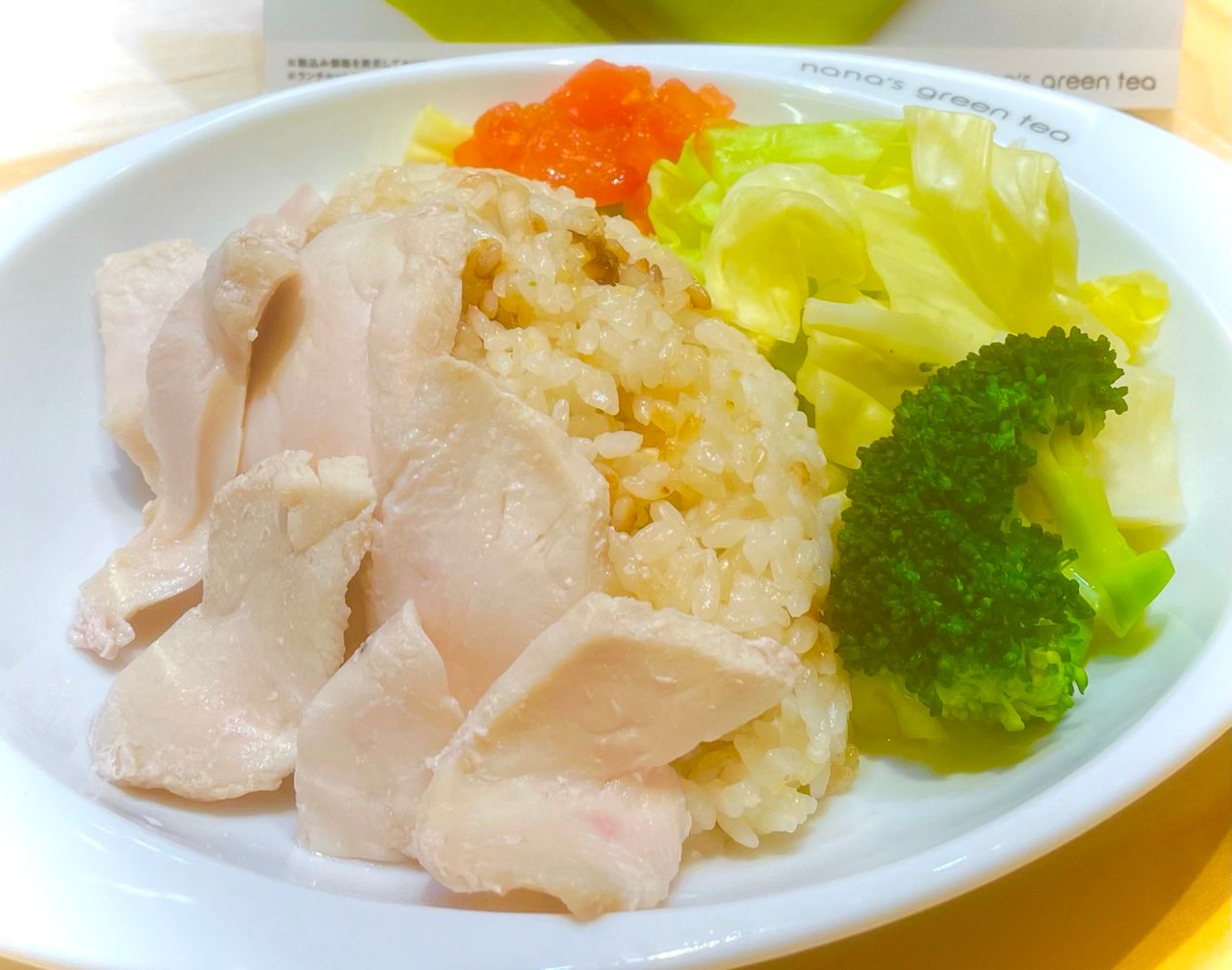 椎茸と生姜で炊き込んだ炊き込みご飯に、低温調理で柔らかく仕込んだ蒸し鶏のスライスをのせて、