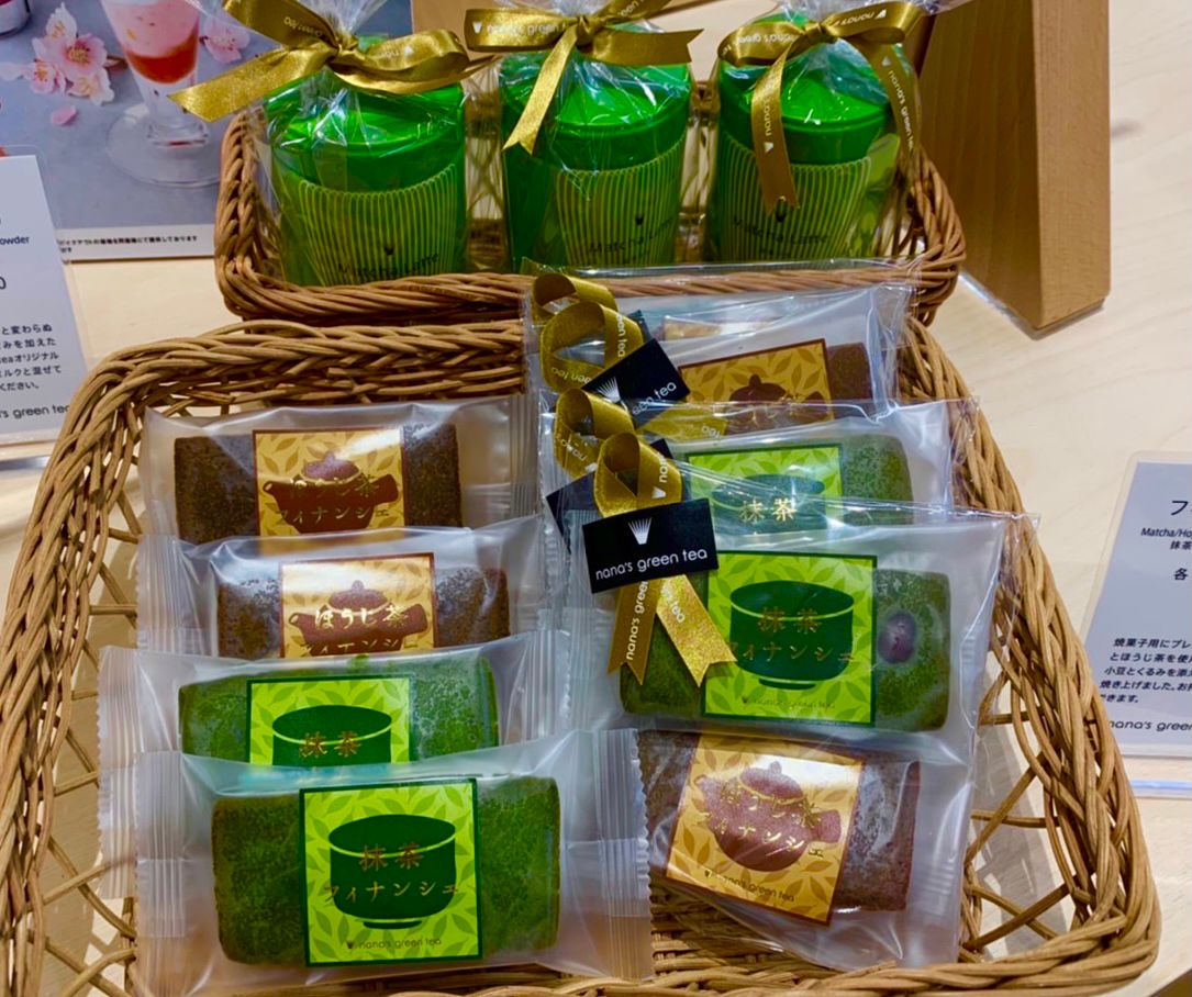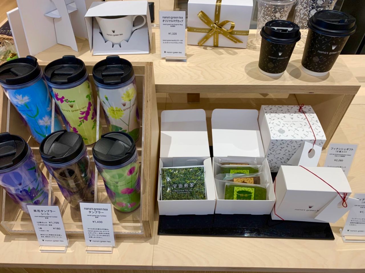 当店のグッズコーナーでは、抹茶のフィナンシェやほうじ茶のフィナンシェ、抹茶ラテ缶をはじめ、当店の人気商品のひとつ宇治煎茶のティーパックやタンブラーにマグカップなんかも販売いたしております。