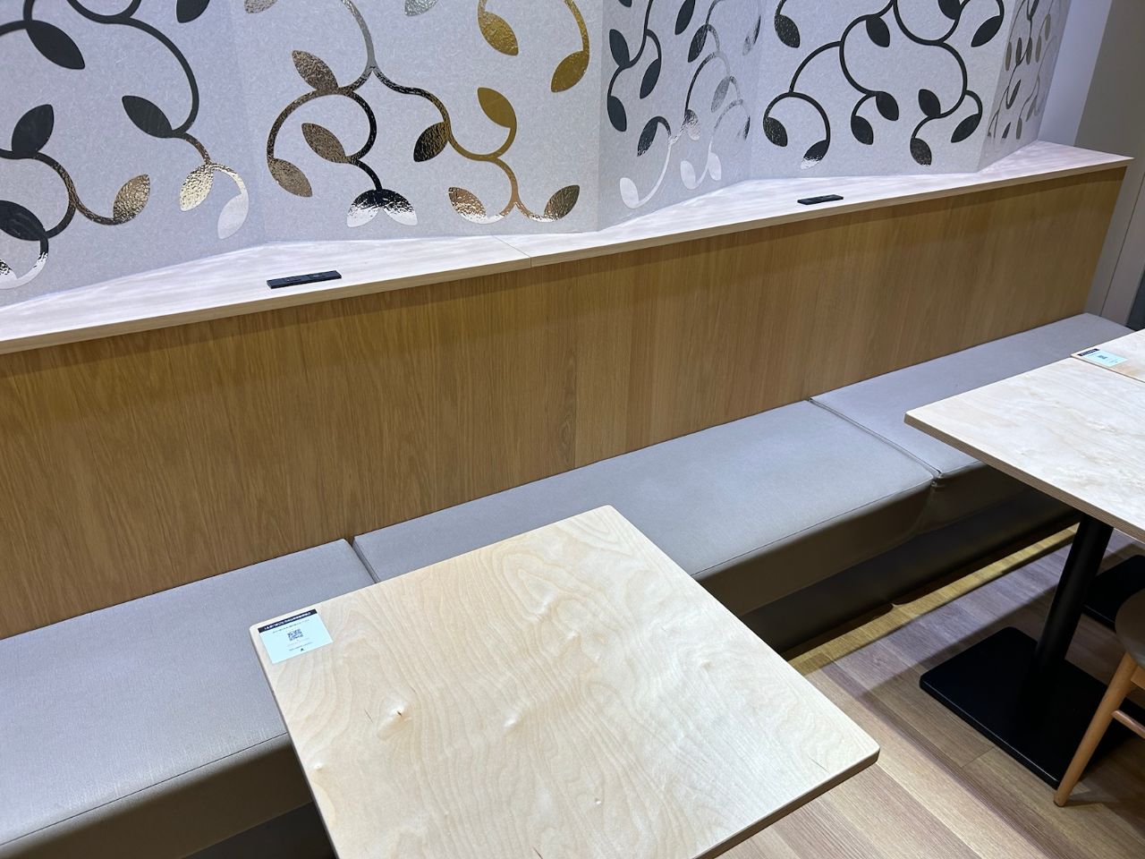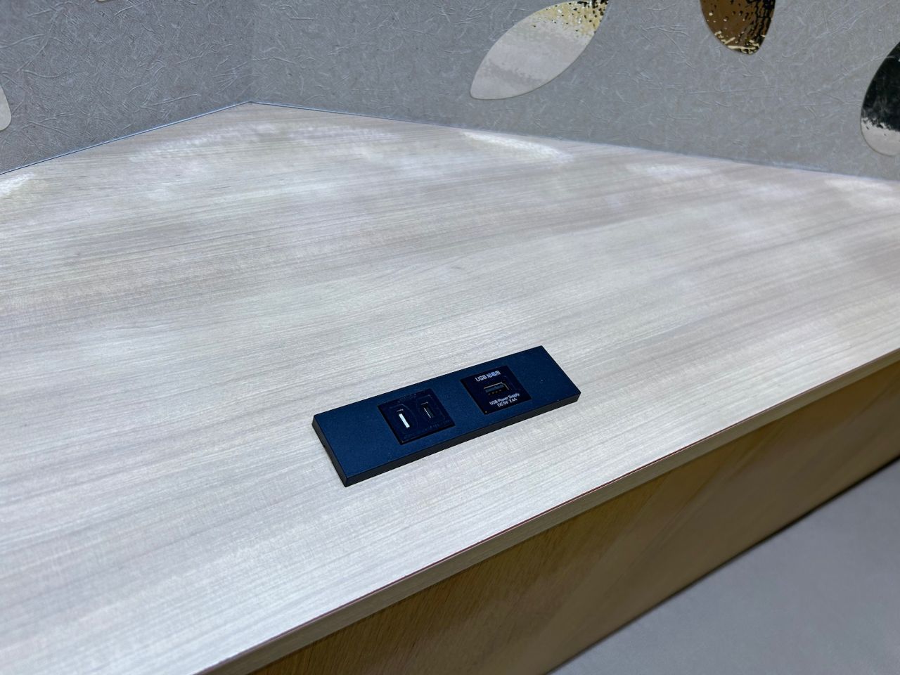 当店ではカウンター席と中央のソファー席をのぞく全てのお席にコンセントとUSBポートを設置しております。