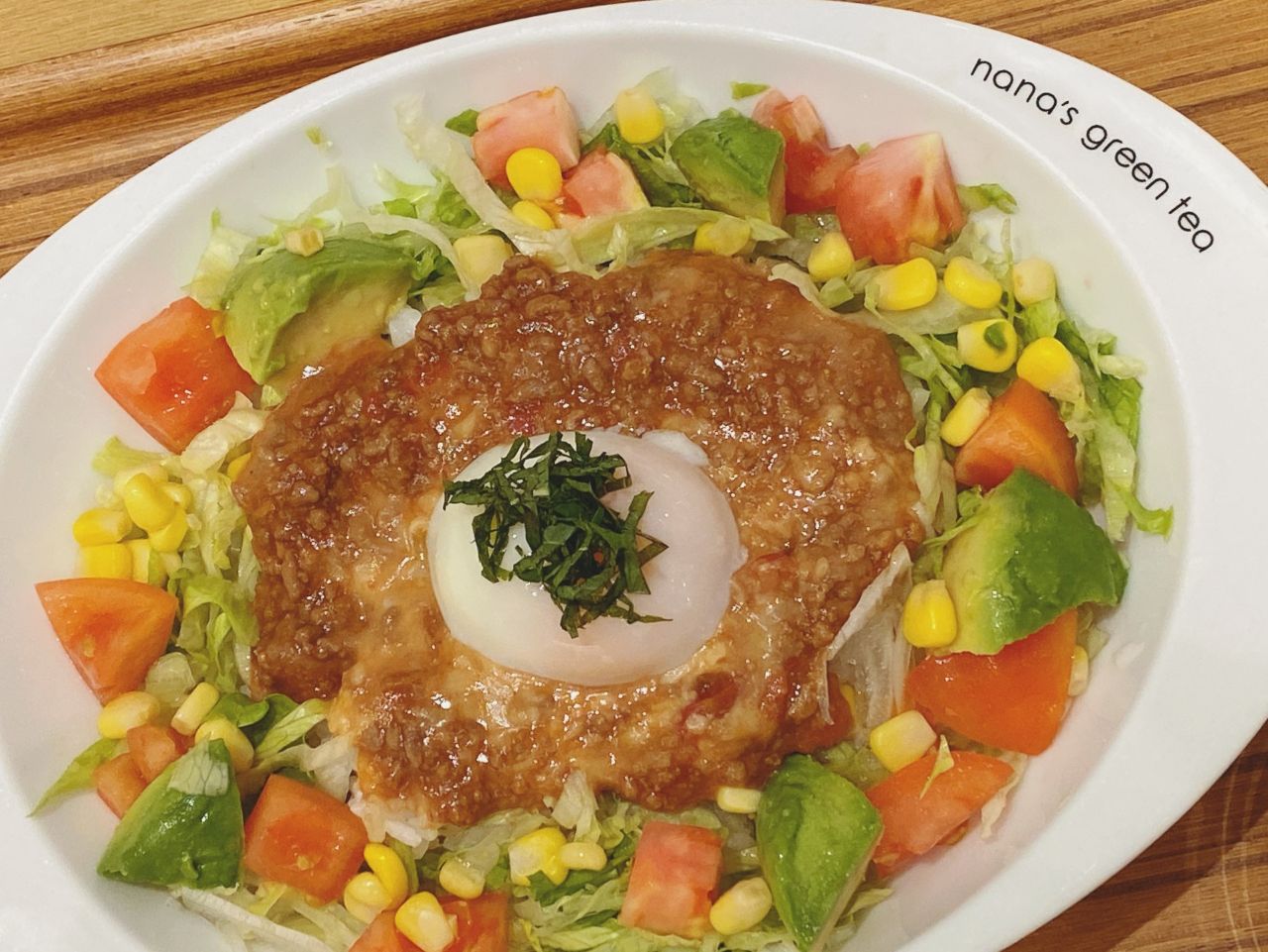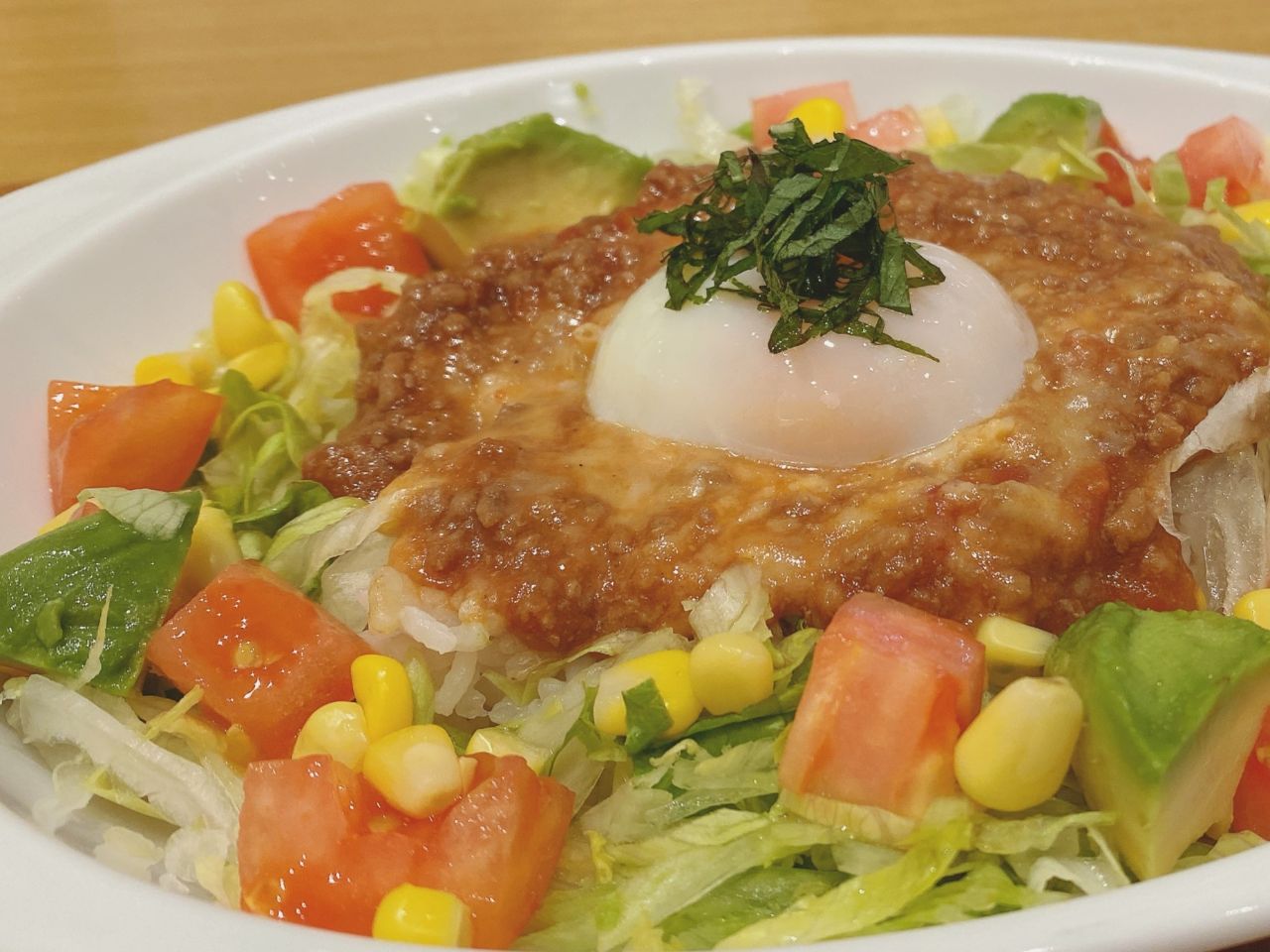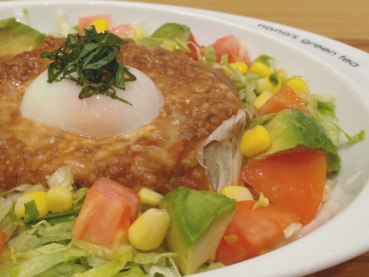 ミートソースのようなトマトの酸味が効いたお肉は、温めたチーズや上に乗っている温泉卵と混ぜ合わせることでクリーミーな味わいになっています。