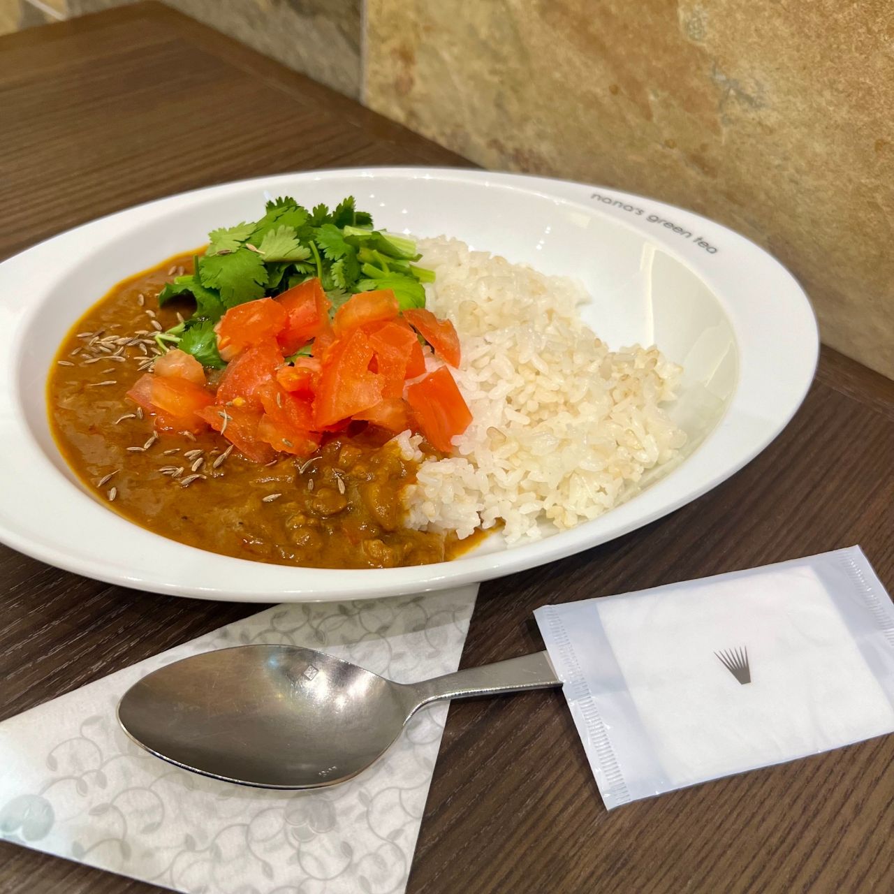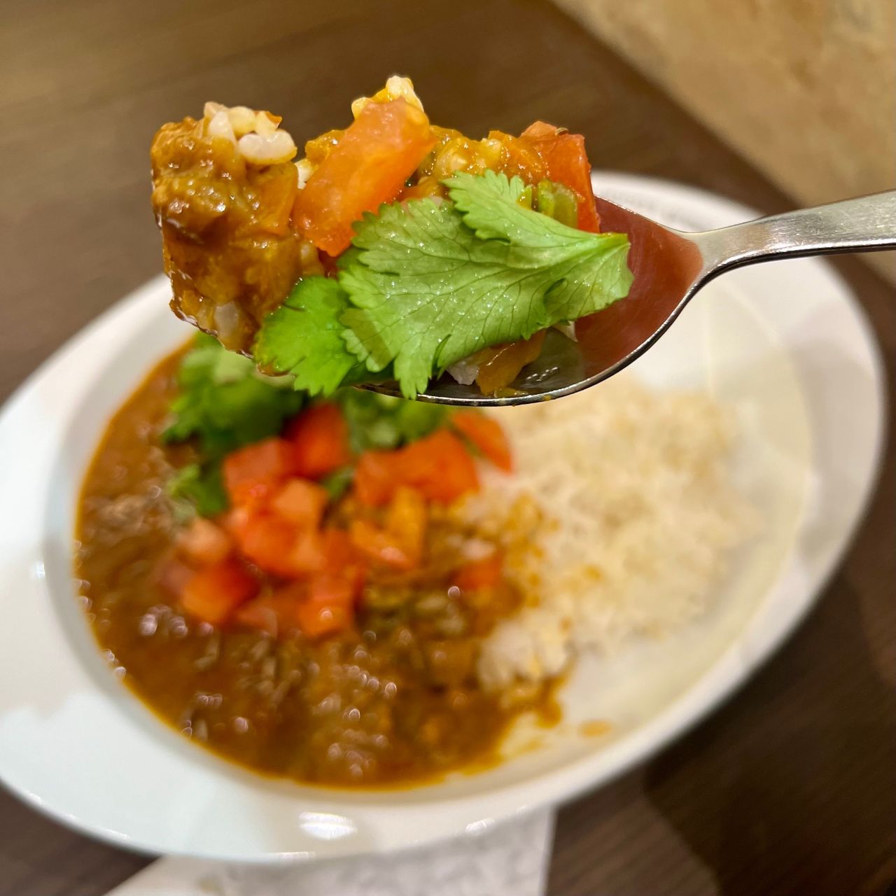 パクチーの緑とトマトの赤色がキーマカレーを彩りよくしてくれます。