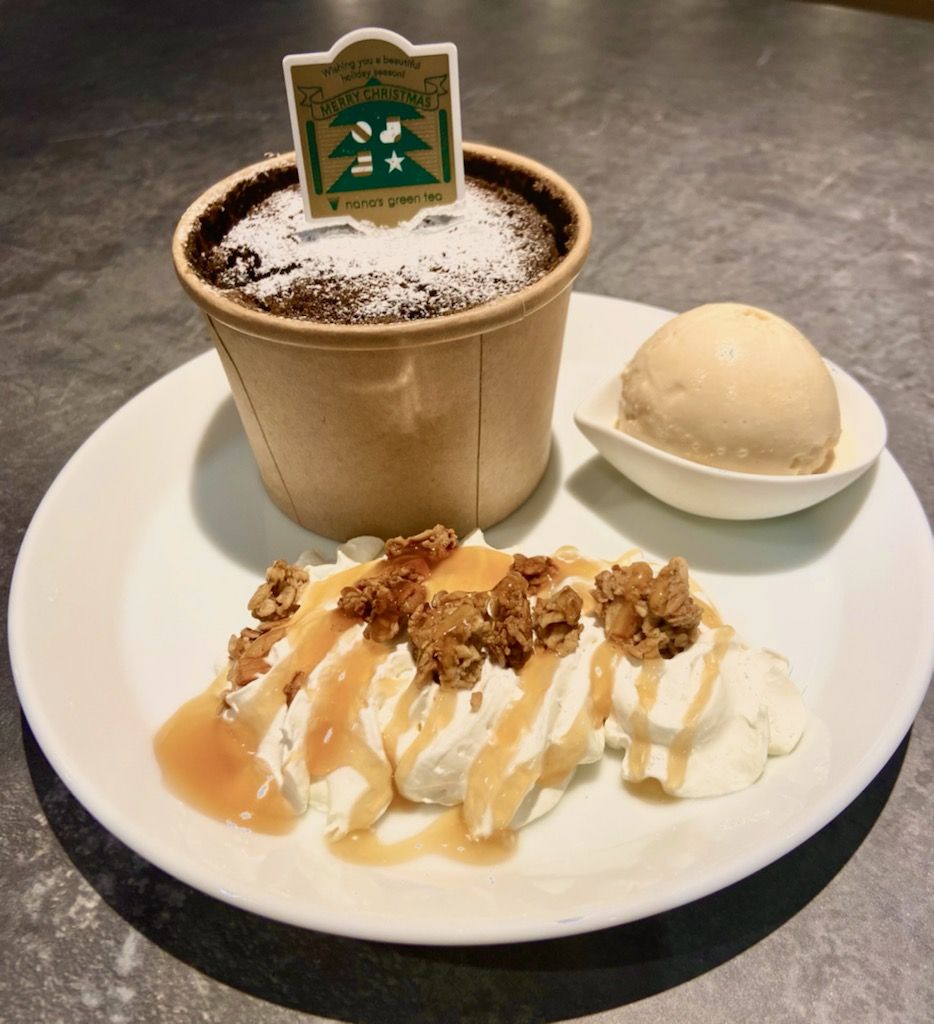 温かいほうじ茶フォンダンショコラ、キャラメルアイスと一緒に