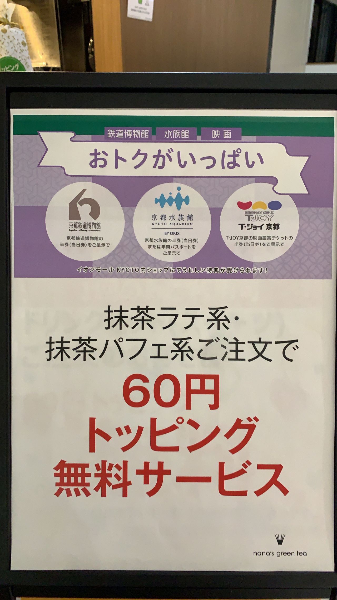 「京都鉄道博物館の当日券」のいずれかをお持ちいただくと「抹茶ラテ系・抹茶パフェ系」のご注文で