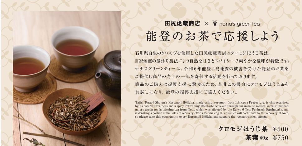 能登のお茶:「クロモジほうじ茶」を販売し、売上の一部を義援金として現地に寄付する取り組みを行います。