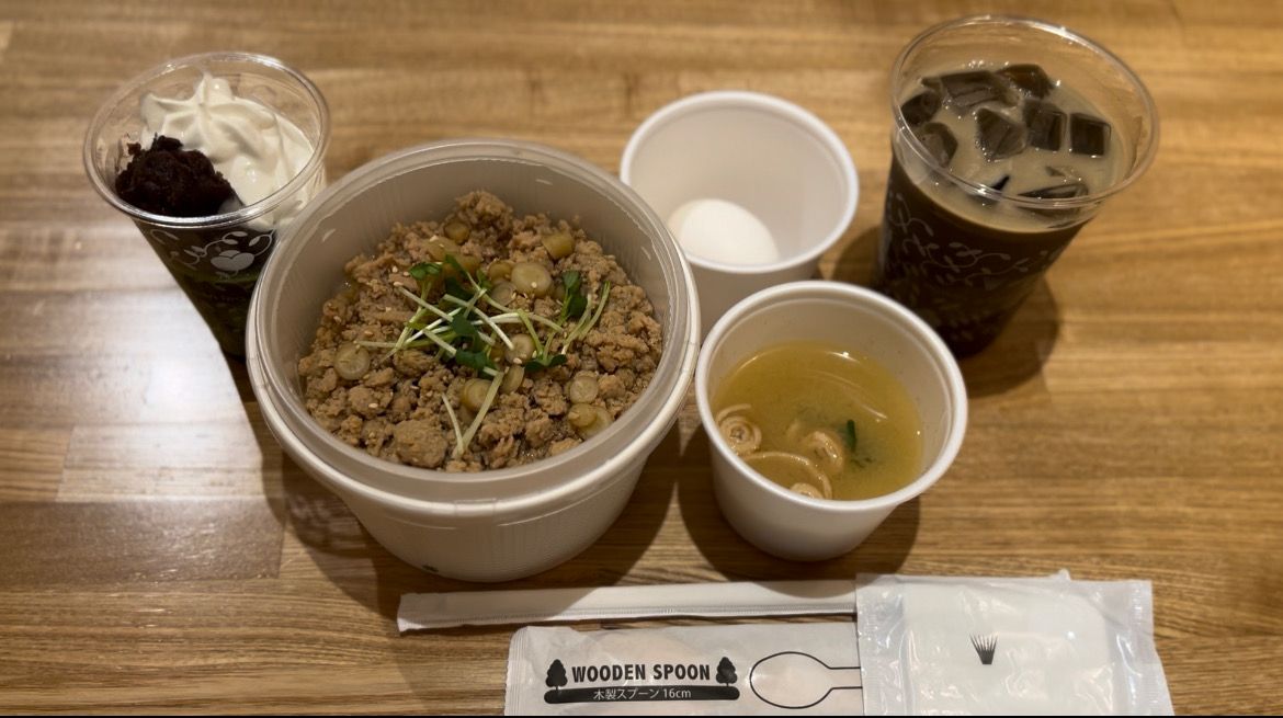写真(とりそぼろ丼/ほうじ茶ラテ/抹茶ゼリー)