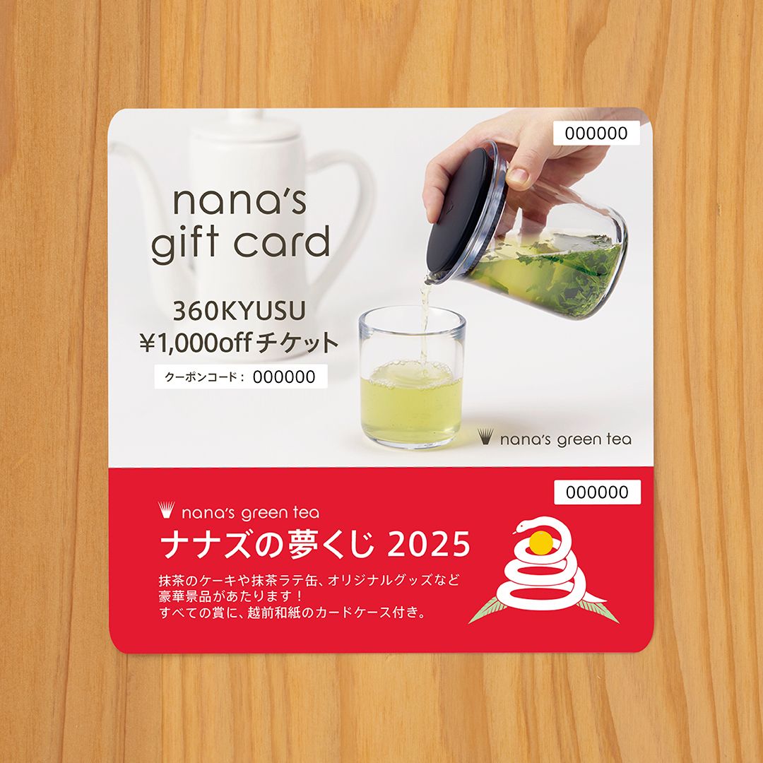 nana's green tea各店舗、公式オンラインストアにて使用できる「360KYUSU」の¥1,000offチケットです。