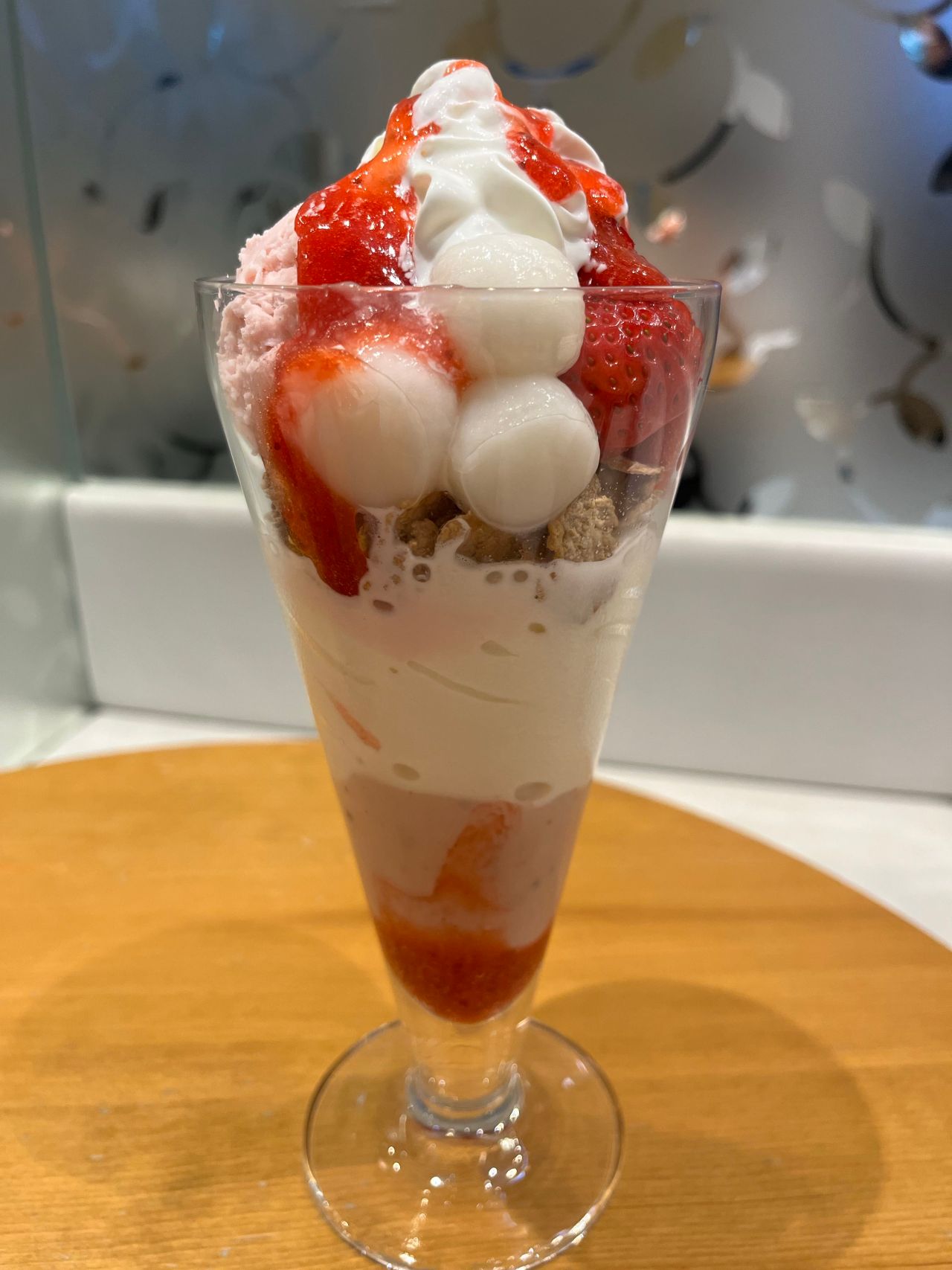 下の層からいちごのソース、桜クリーム、スポンジケーキ、ソフトクリーム、玄米フレーク、ストロベリーアイス、桜あん、白玉、いちご、ホイップクリーム、最後にいちごのソースがかかっています!
