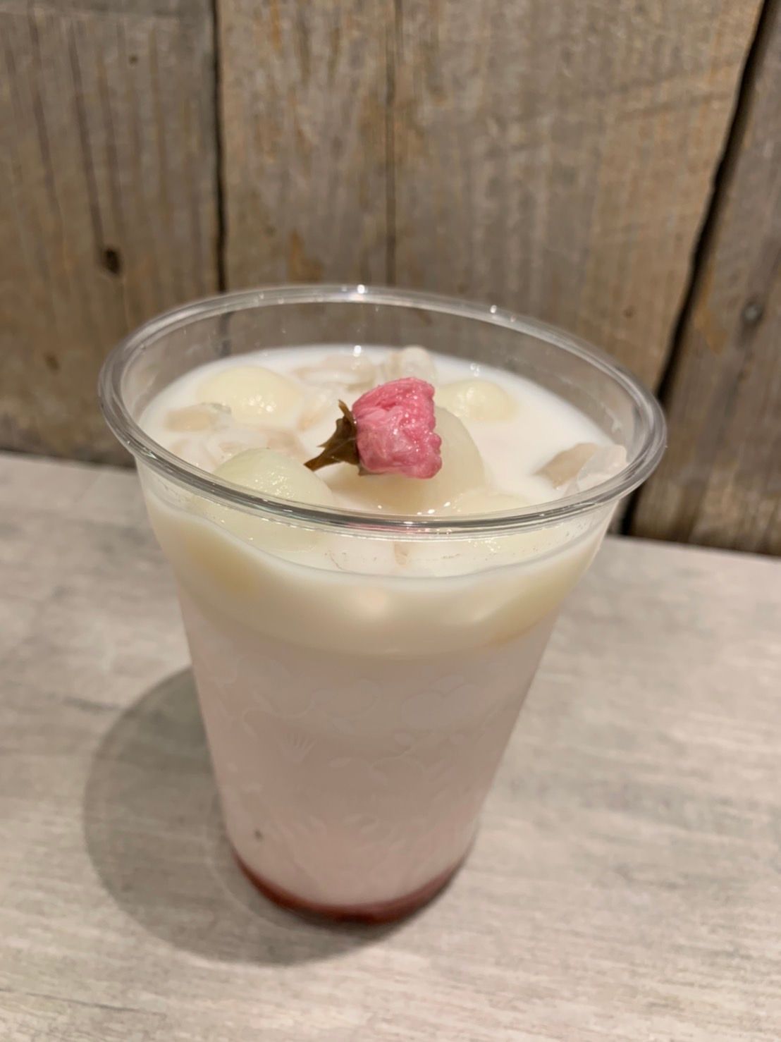 濃厚な桜のあんこのラテに甘酸っぱい苺ソース、もちもちの白玉に
