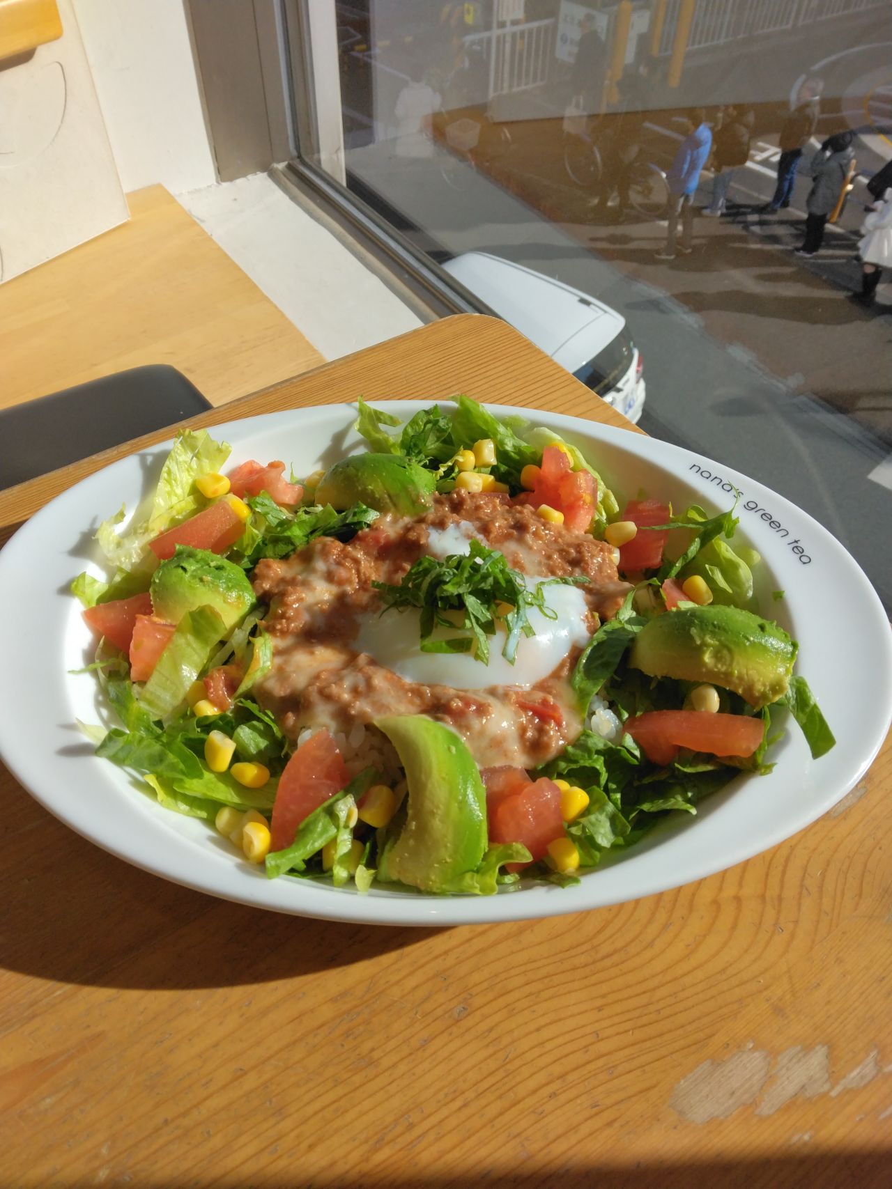 野菜たっぷりのタコライスに温泉卵を乗せ、