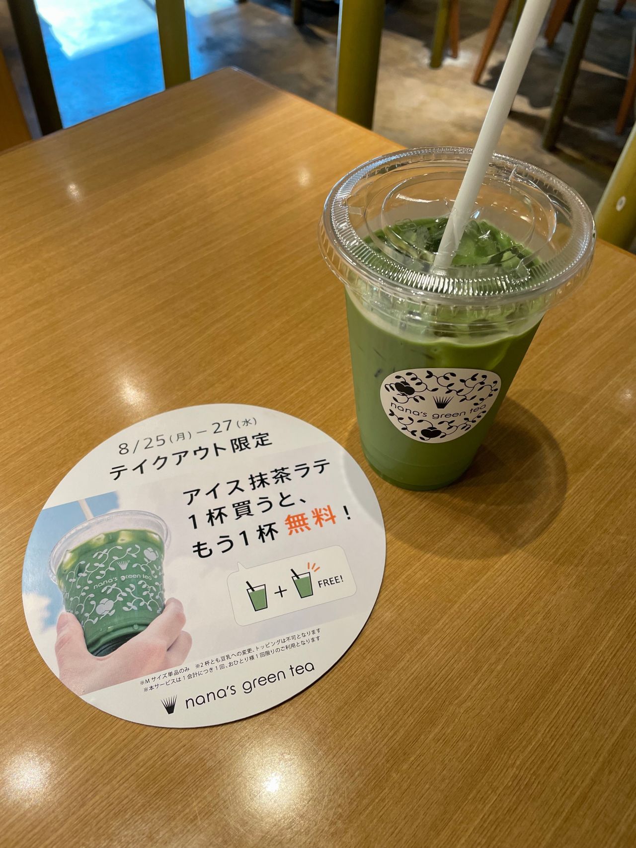 アイス抹茶ラテMサイズを1杯買うと2杯目が無料でお持ち帰りいただけます!