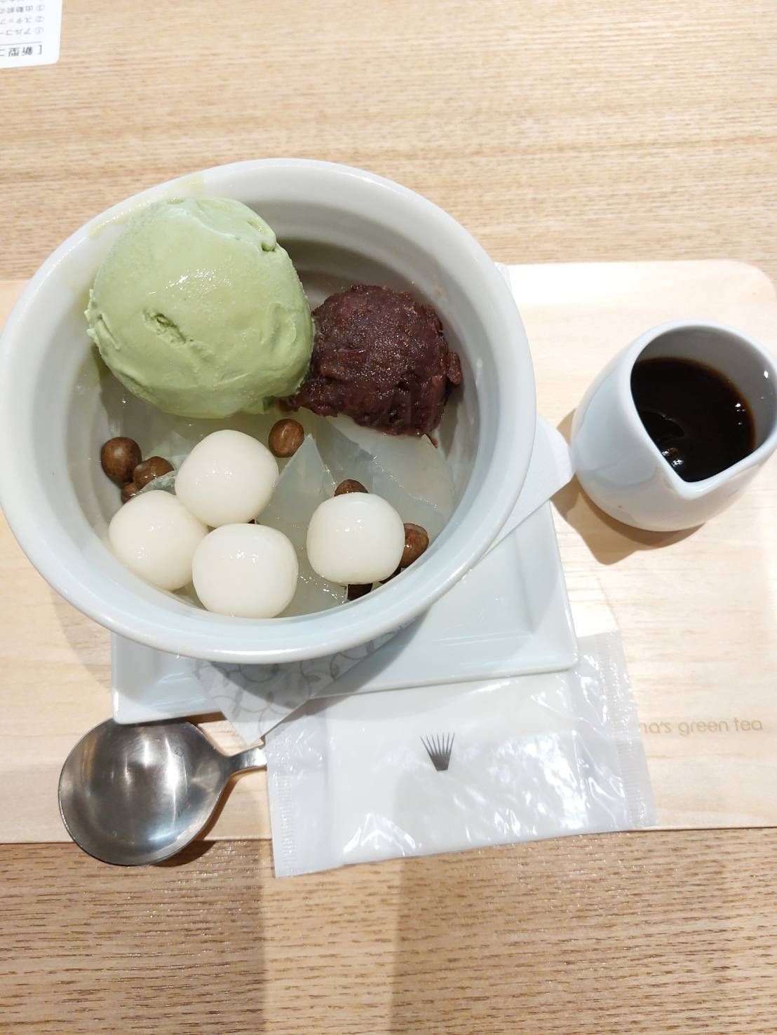 北海道十勝産小豆の小倉あん、抹茶アイス、赤豆、白玉が入っています。