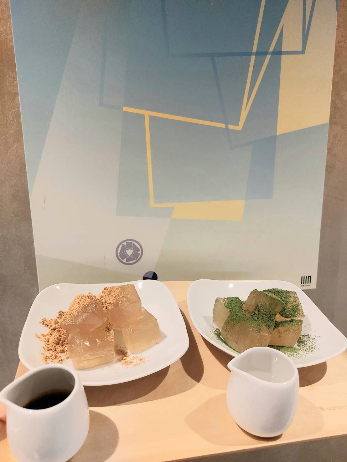 定番のわらび餅は、きな粉に黒みつをかけます。