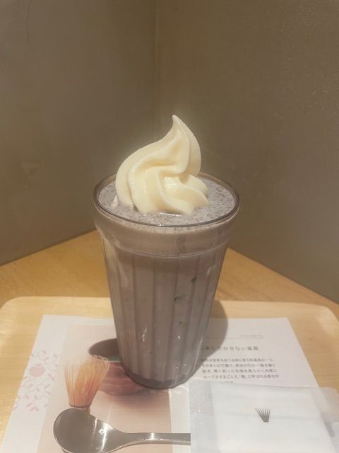 黒胡麻あんラテに、ソフトクリームをトッピングしたデザート感覚のドリンクです♪