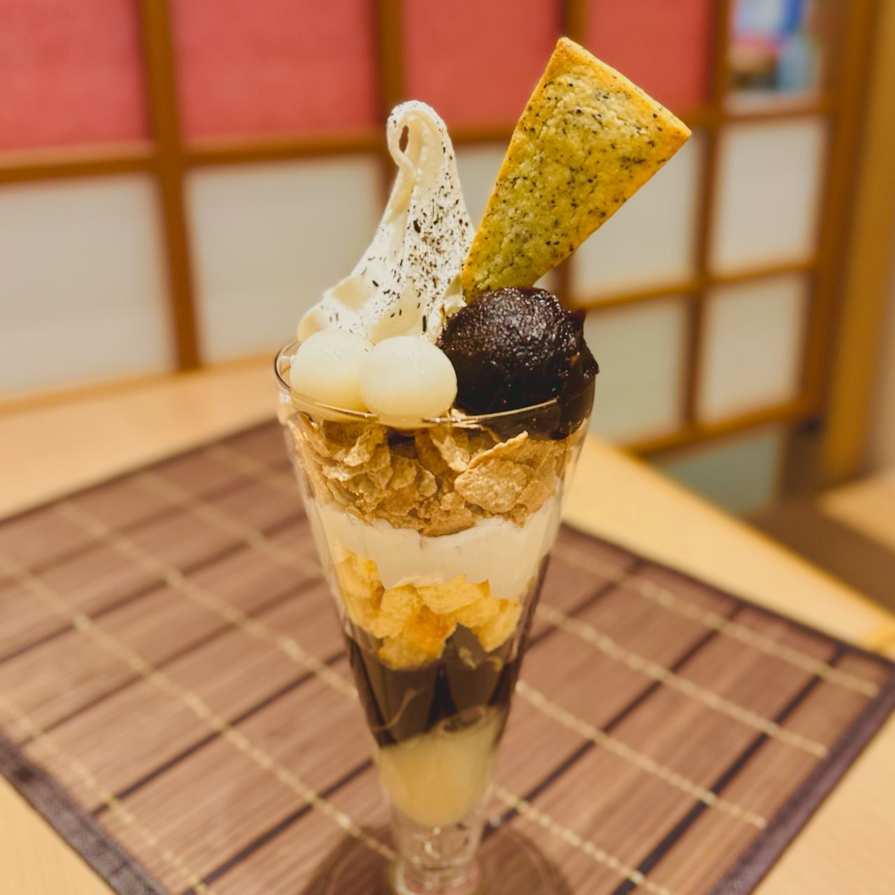 ウーロン茶とホワイトチョコレートを組み合わせた「ウーロンパフェ」。これまでの抹茶やほうじ茶を中心としたメニューから一歩踏み出し、ウーロン茶という新しい素材を使った挑戦的な一品です。