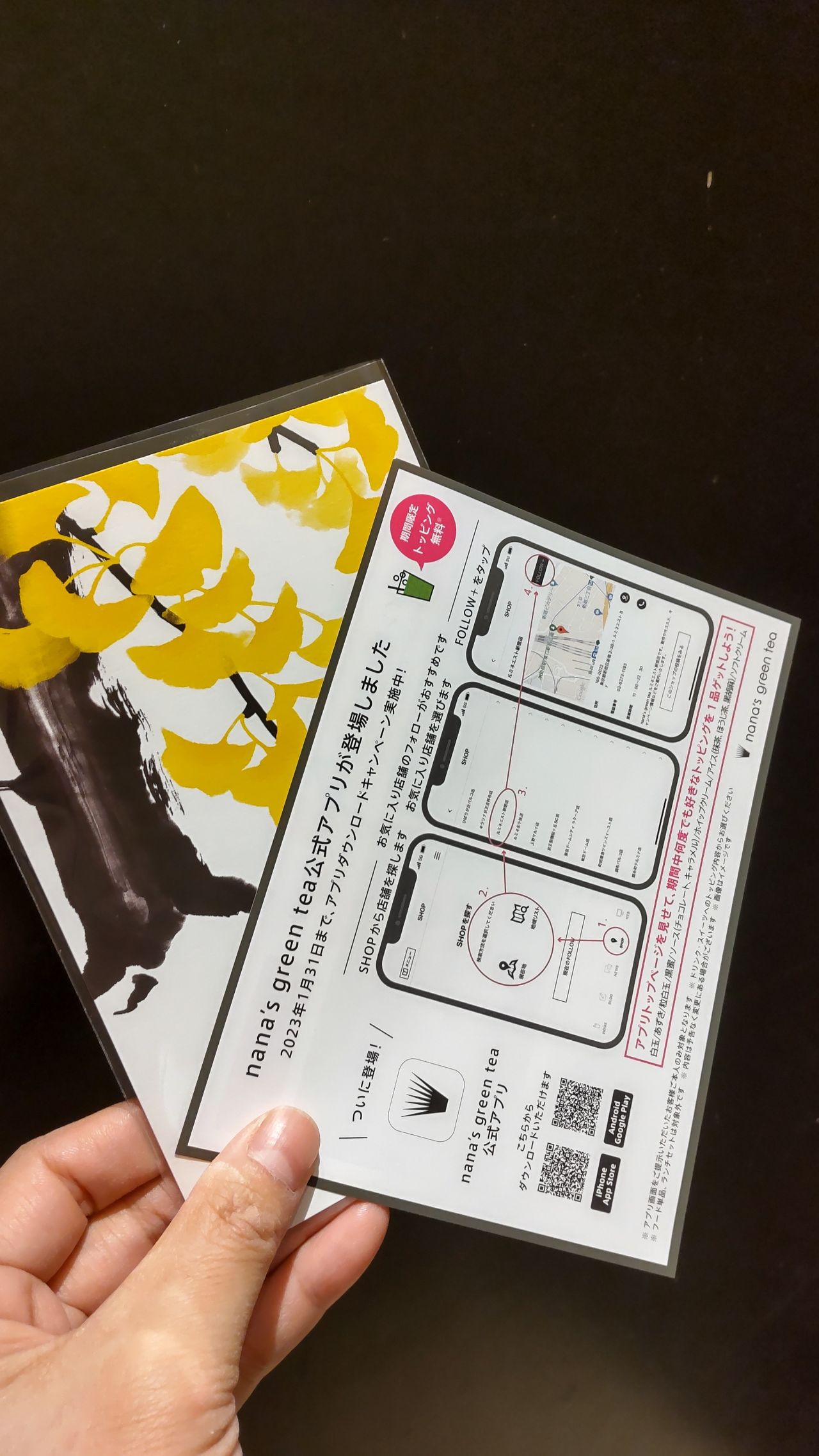 現在、店頭では月初めにお渡ししているポストカード(今月は銀杏)と共に、ナナズグリーンティ公式アプリのご紹介のチラシもお渡しさせていただいています!