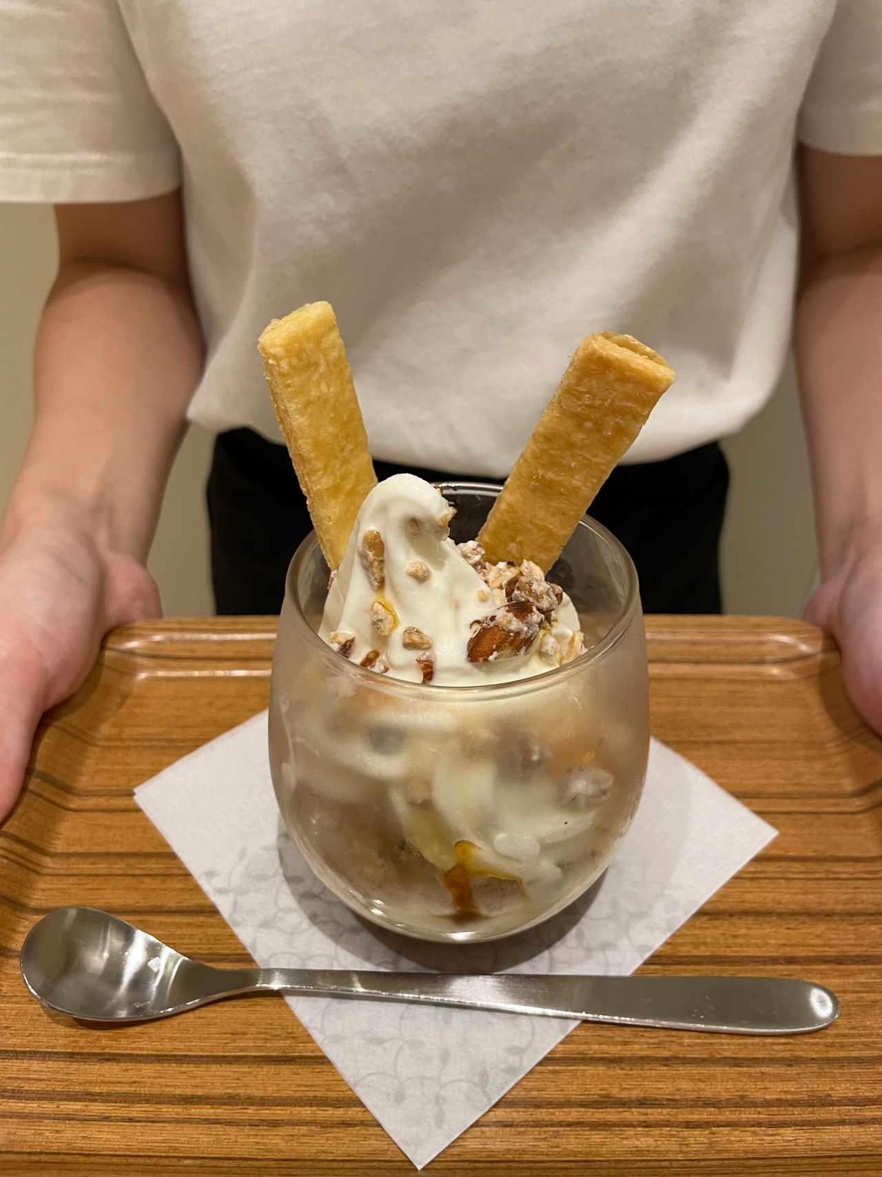一番上にクルクルっとソフトクリームを巻いてハニーシロップとアーモンドクランチをふりかけ、棒状のパイが2本さして完成!