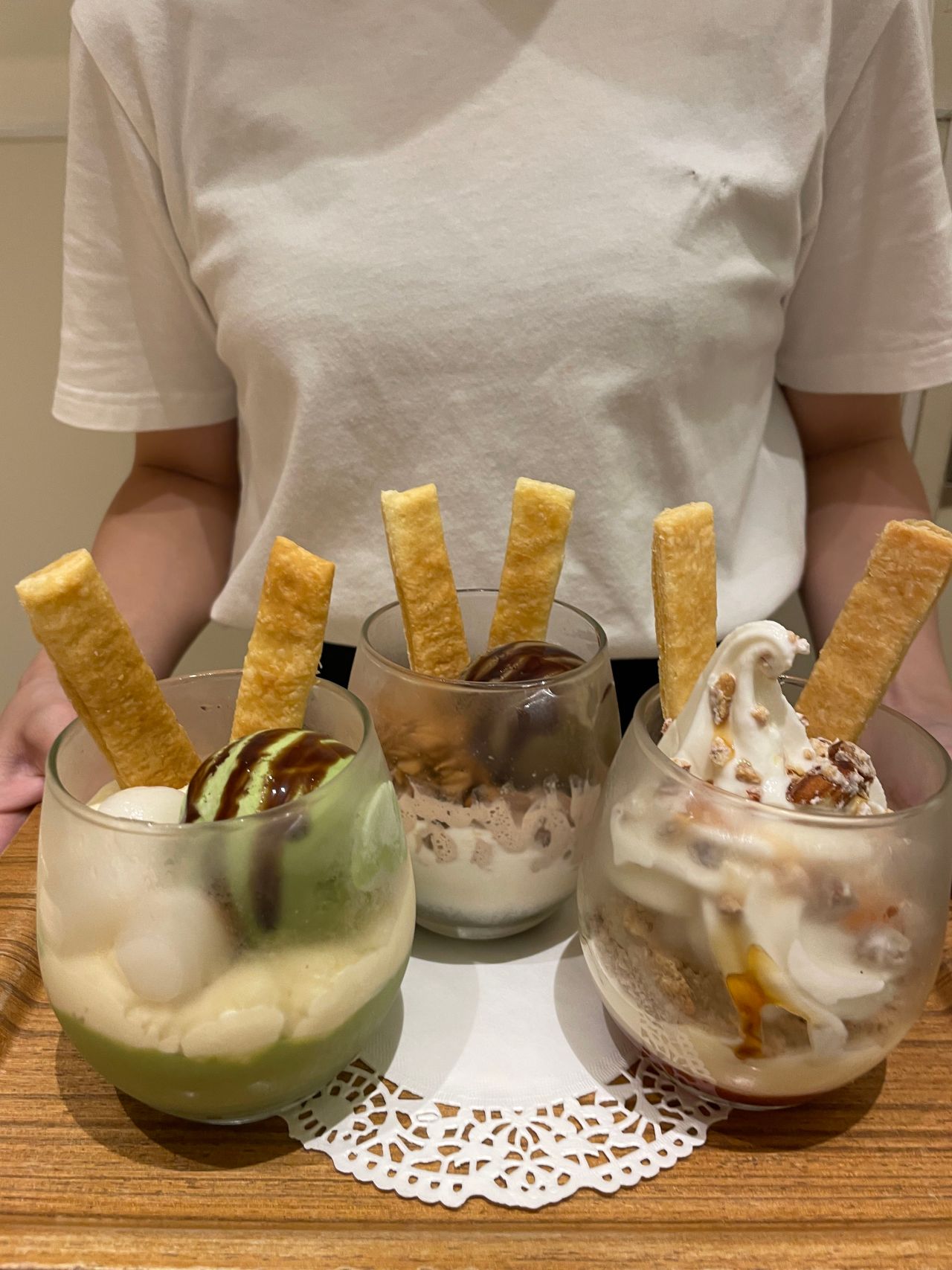下段からほうじ茶ゼリー、ソフトクリーム、スポンジ&ショコラクリーム、一番上にほうじ茶のアイス、グラノーラフレーク、棒状のパイを2本さして完成!