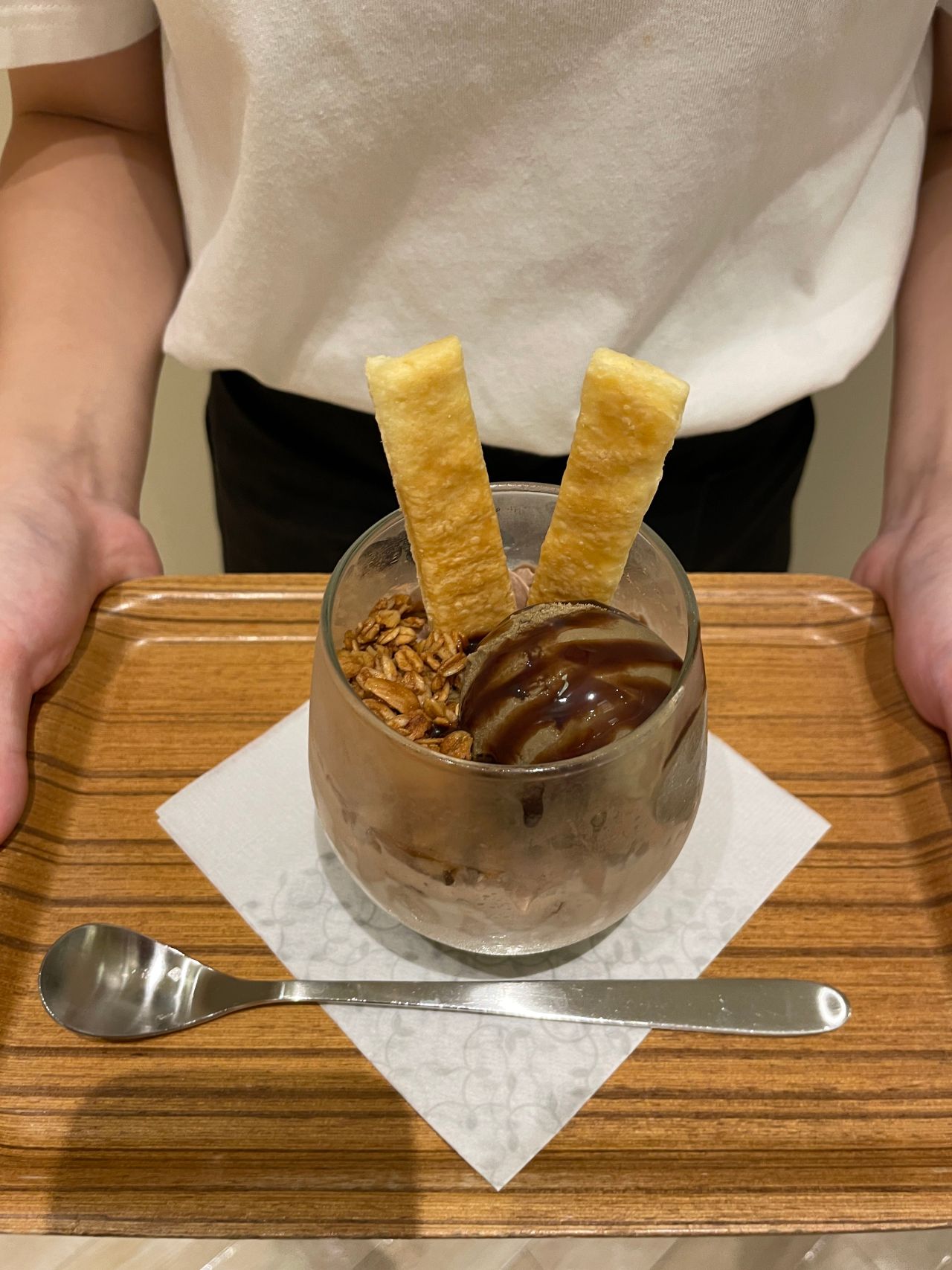 ソフトクリームとほうじ茶アイスが1つのグラスで楽しめる、アイス多めのグラスです★