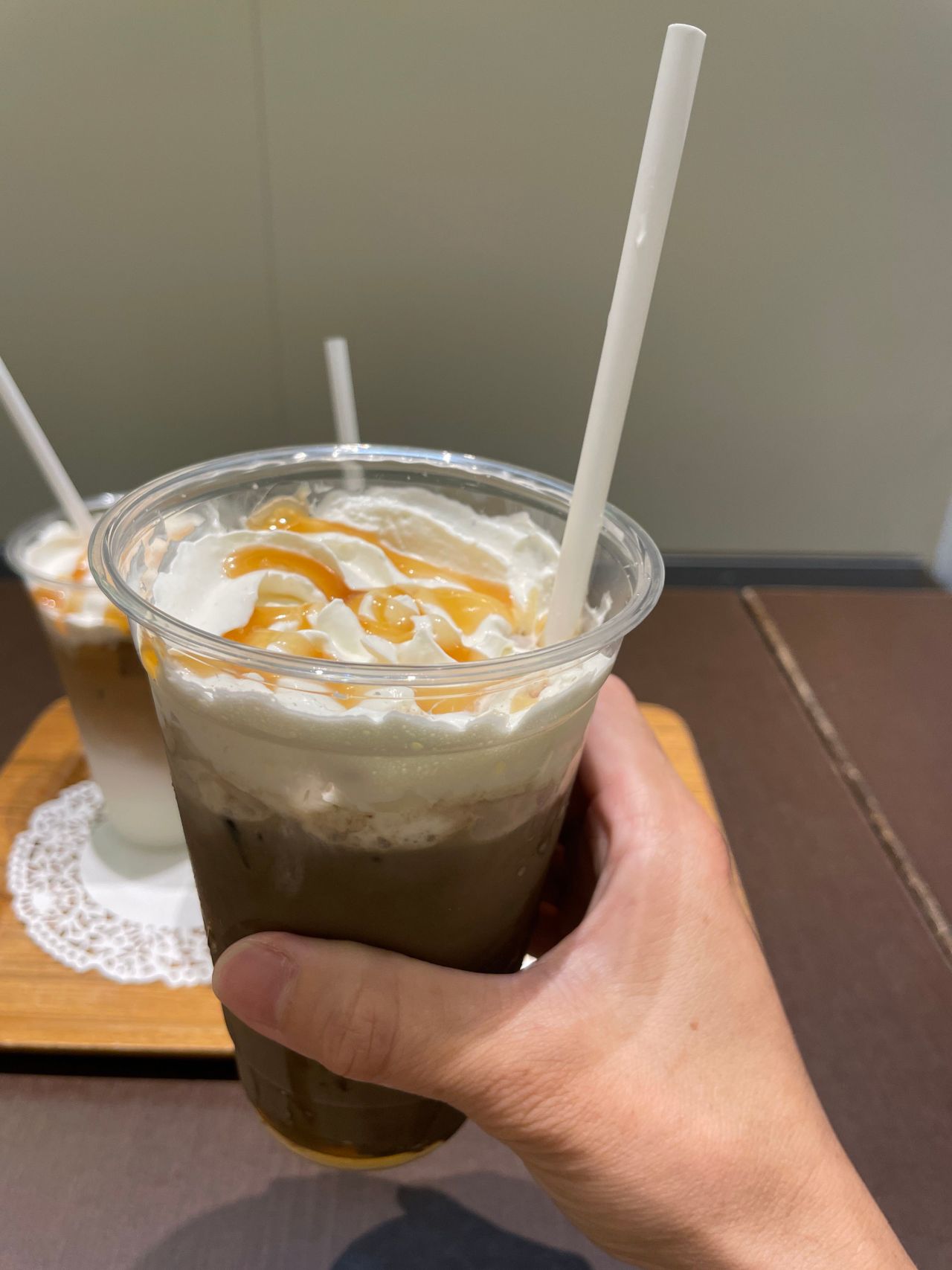 キャラメルとほうじ茶ラテの相性は抜群で、ホイップのおかげでほうじ茶ラテもよりクリーミーになり、鼻からキャラメルの香りが抜けるスイートな味わいです♪
