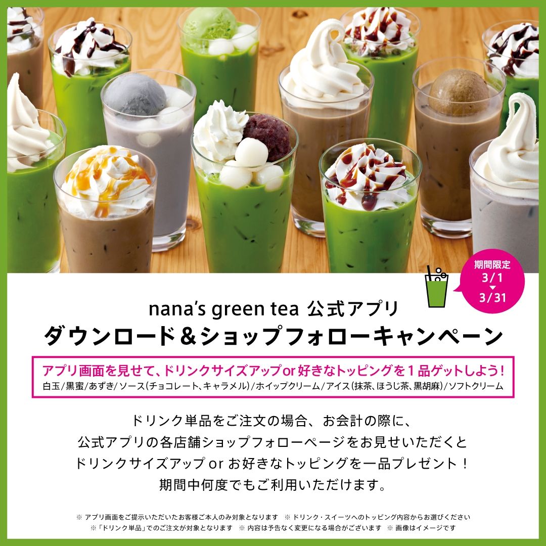 ナナズグリーンティーアプリをダウンロード頂き、更にナナズグリーンティーららぽーと富士見店のショプフォロー画面をレジにてご提示していただいたお客様に、