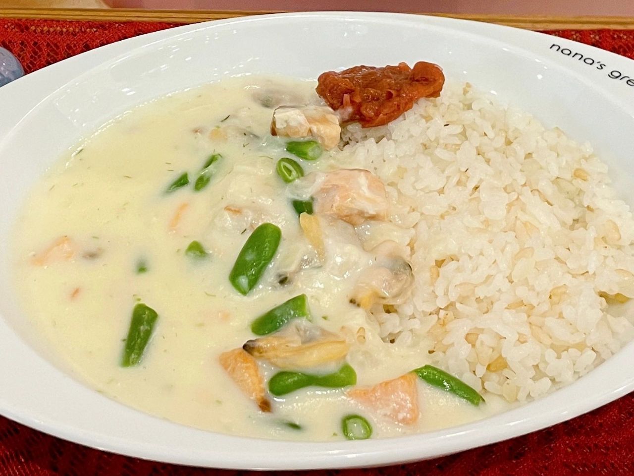隠し味の青のりが洋食のクリームシチューを和のテイストに引き寄せてくれます。