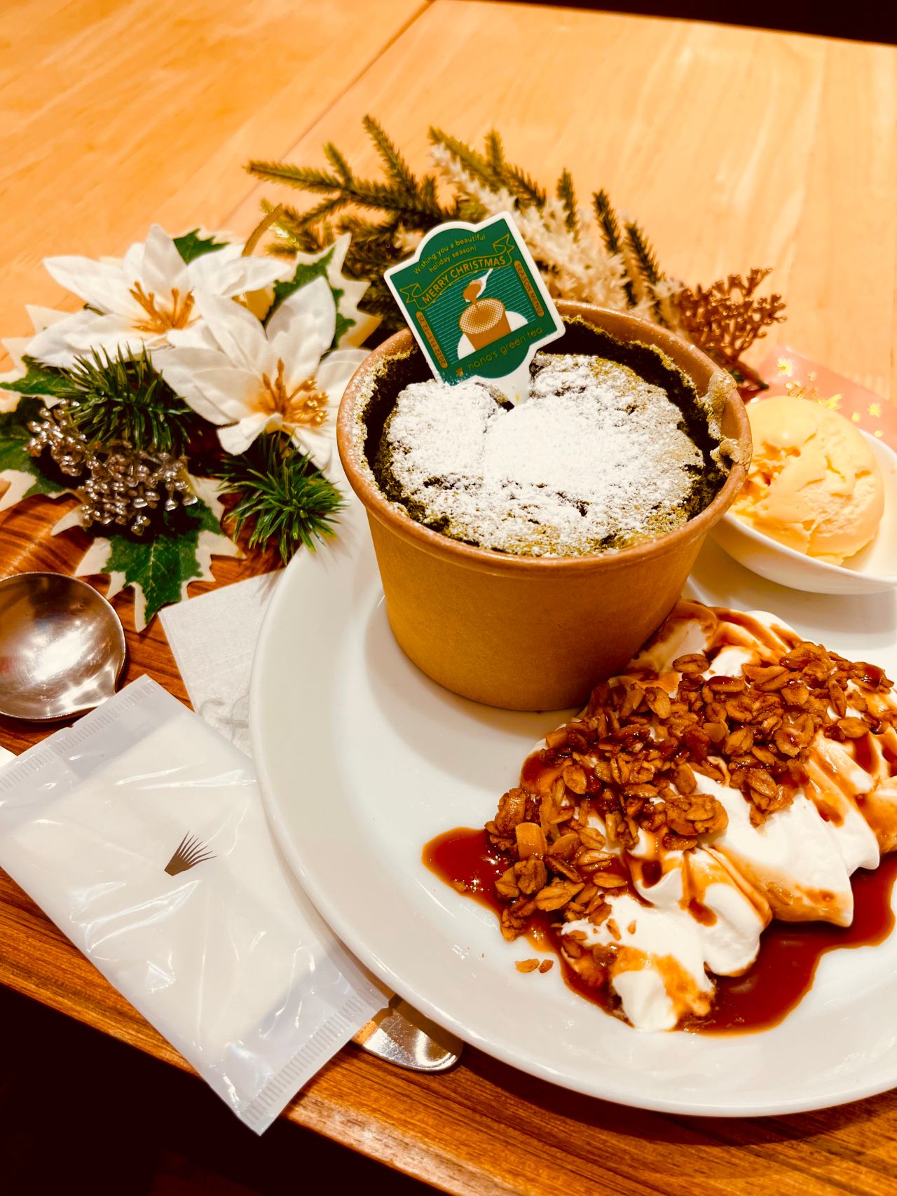 あつあつとろとろのフォンダンショコラにアイス、生クリームとその上にグラノラと黒蜜をトッピングしております。