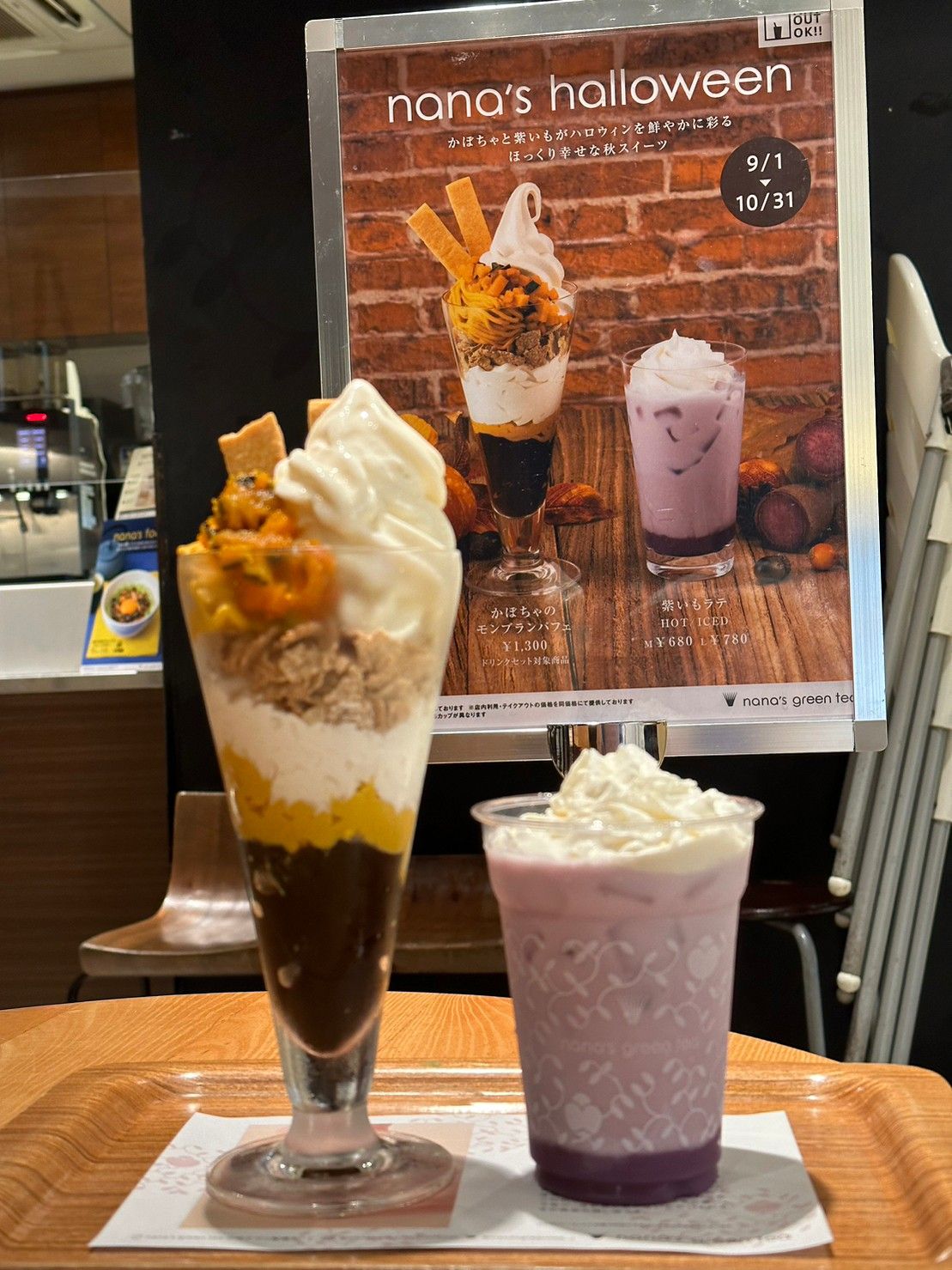 「かぼちゃのモンブランパフェ」と「紫いもラテ」を販売しています。