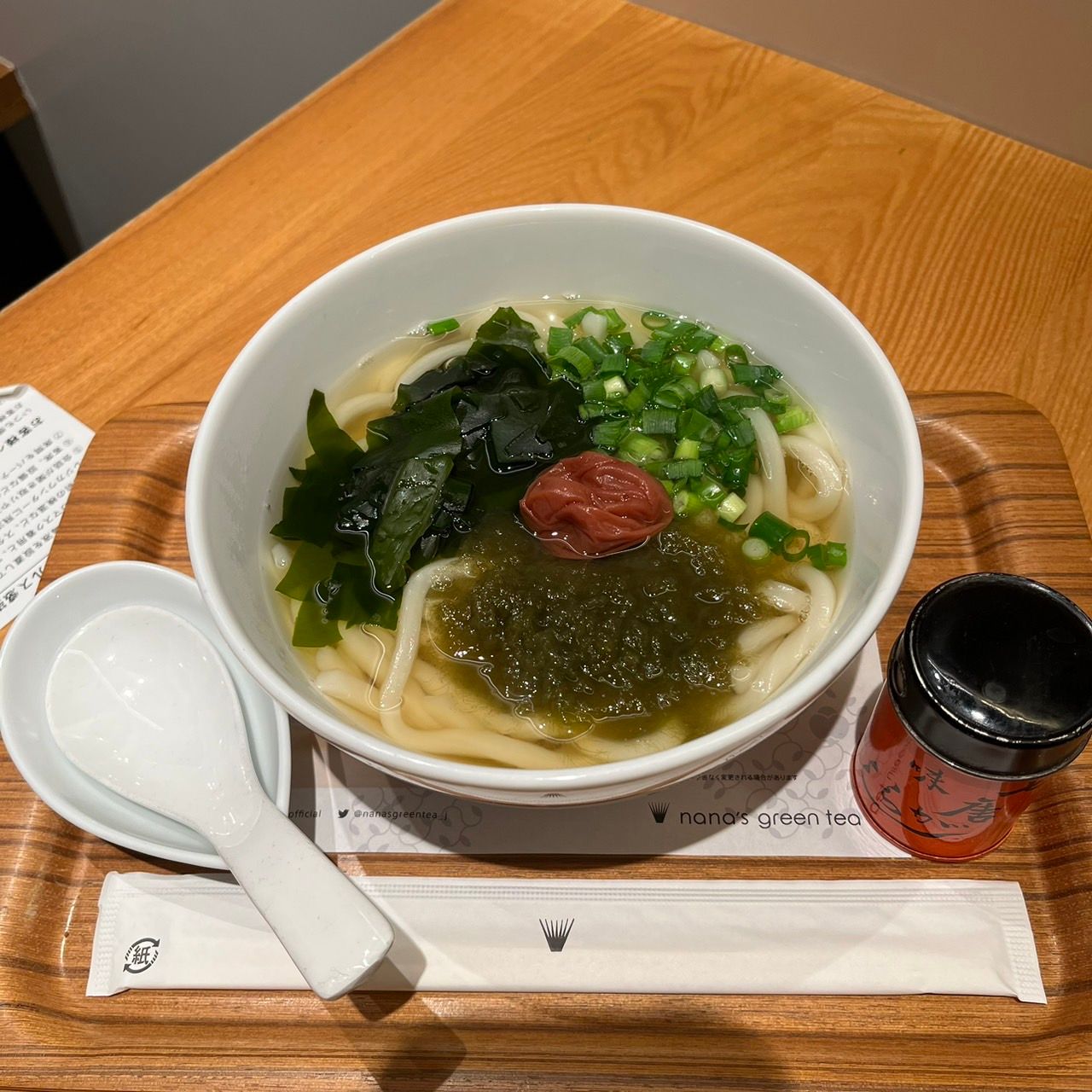 鰹節と昆布で出汁をしっかりとったうどんです。しっかりとした食感の生わかめにとろろ昆布、梅干と体に優しい具材でどこか懐かしさを感じるお食事です。