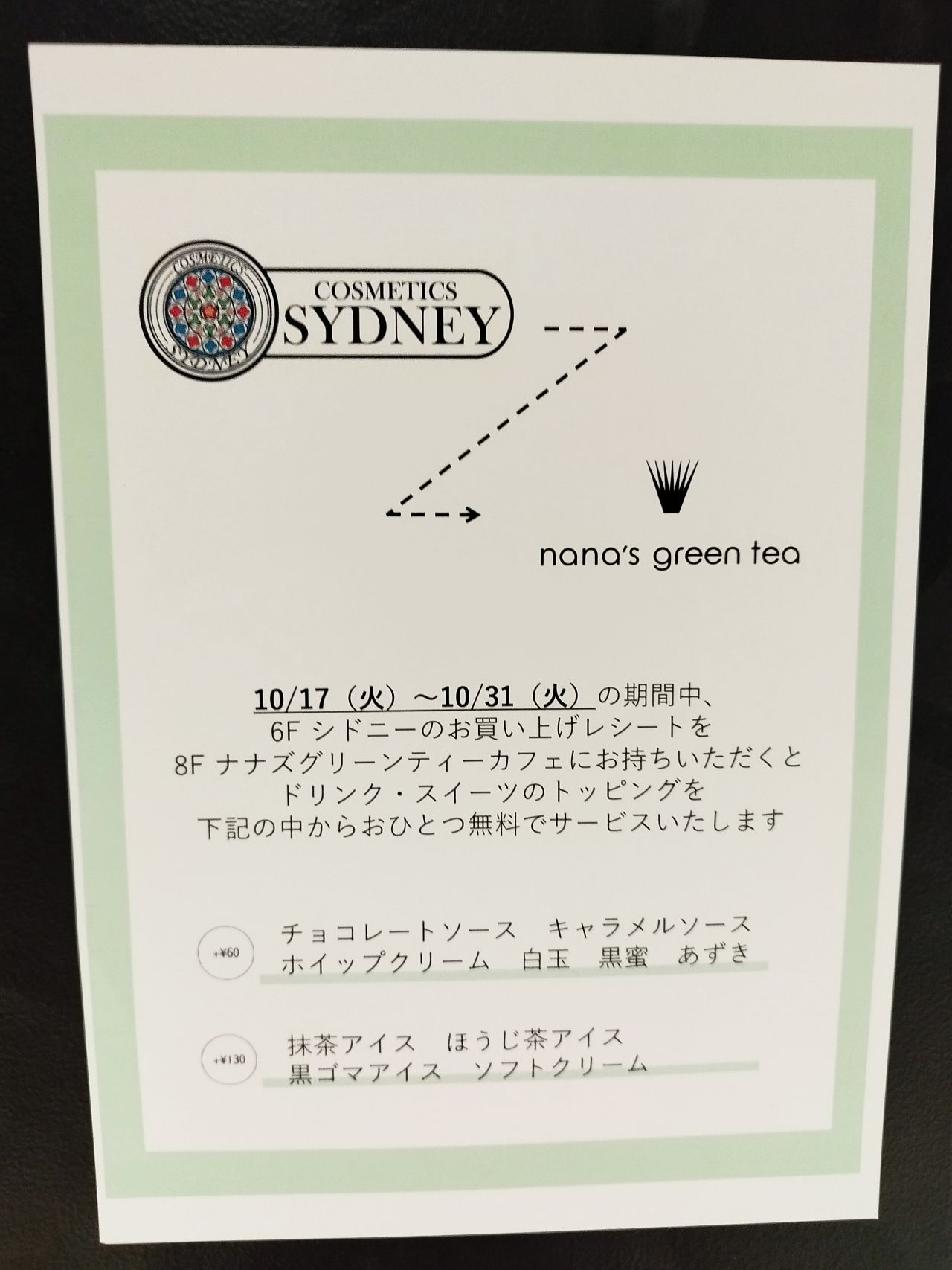 さらに!シドニーさんをご利用されたお客様にはレシートをお持ちいただければドリンク・スイーツのトッピングが無料でおひとつお付けいたします。