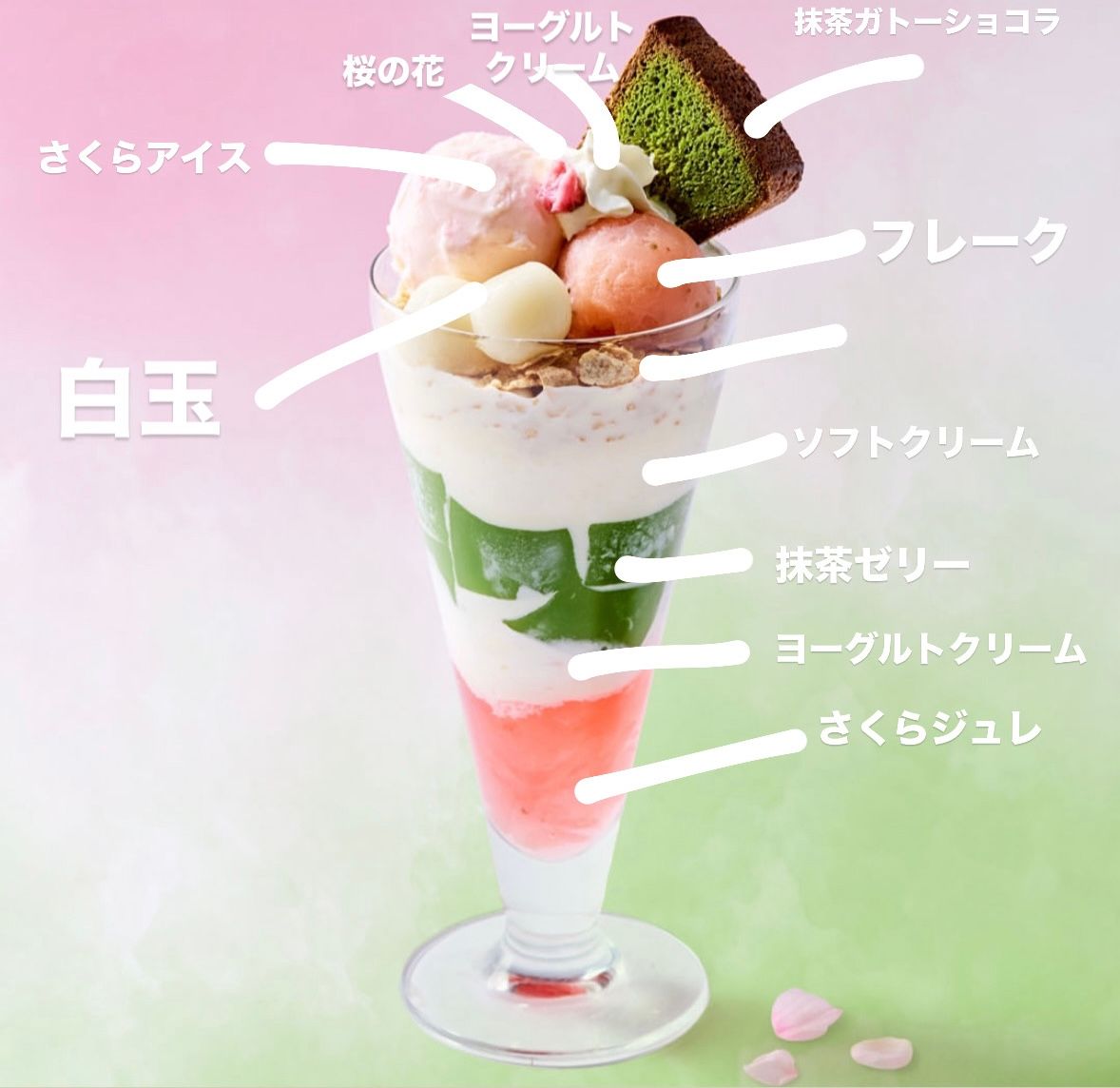 こちらのパフェはさくら好きな人にはたまらないパフェとなっております!また、抹茶ガトーショコラと抹茶ゼリーの緑で映えること間違いなし!!