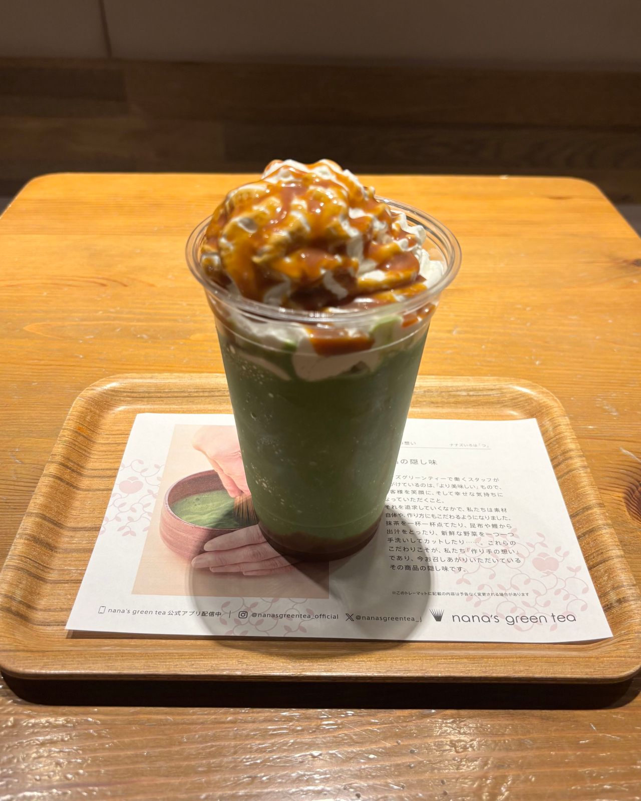 本日紹介するのは、抹茶ラテフローズンにホイップクリームとキャラメルソースをトッピングしたオリジナルフローズンドリンクです!
