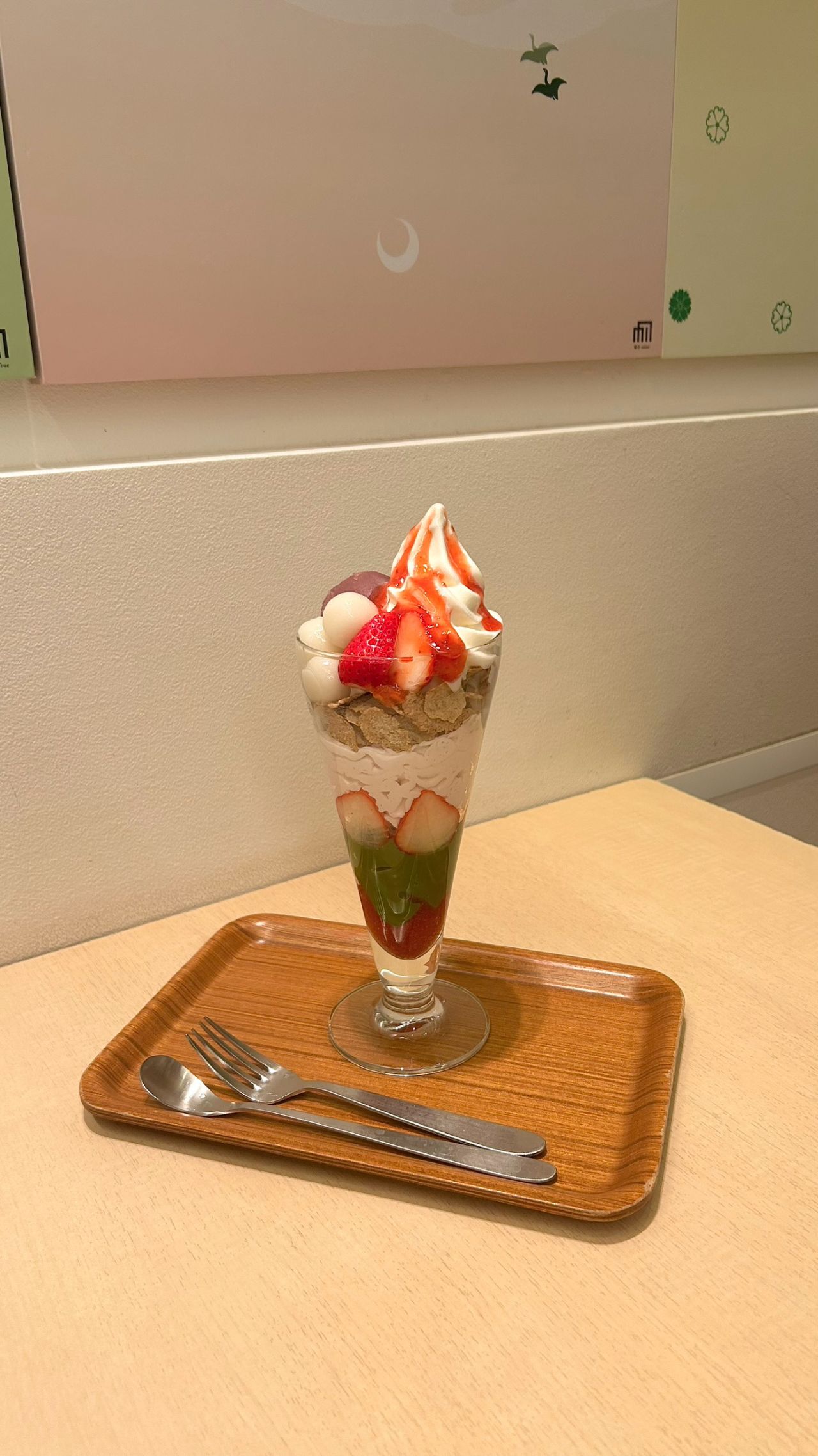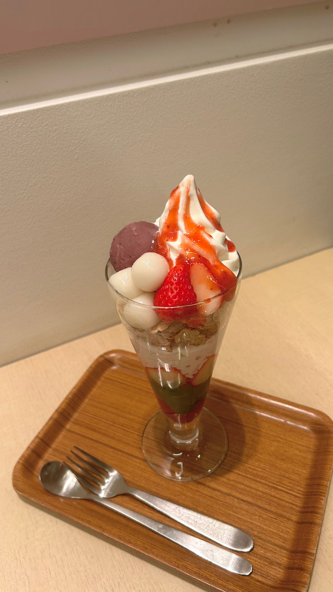 このパフェは、苺あんホイップクリーム→玄米フレーク→トッピング、で作られています。