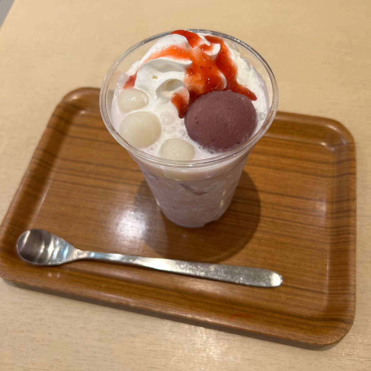 まずはラテだけ味わって、白玉やホイップクリームを合わせて味わって、苺あんをそのまま味わって、などなど、いろいろな楽しみ方ができちゃいます。