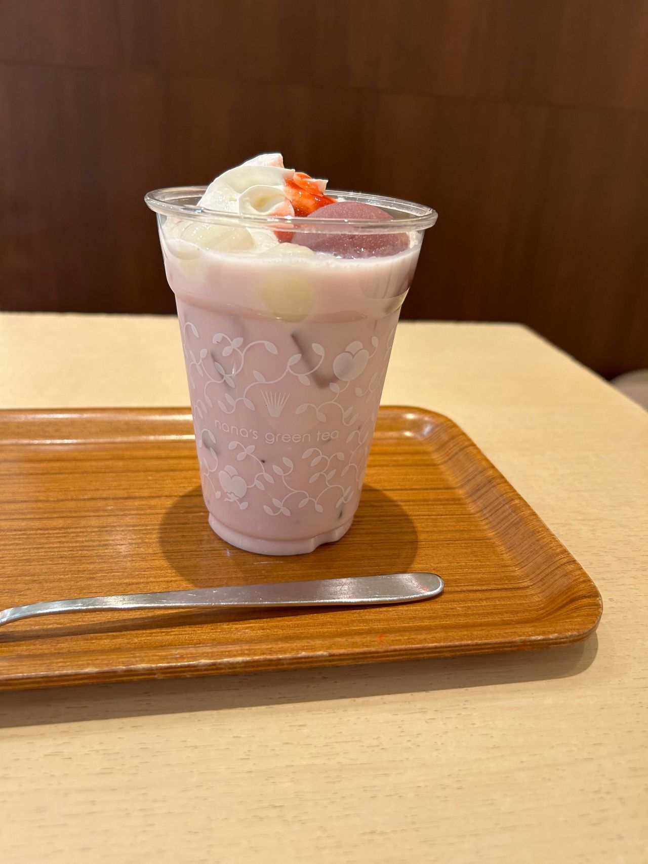ラテは苺あんと牛乳を混ぜた苺ラテの上に、ホイップクリームと苺あん、白玉、さらに苺あんをトッピング。