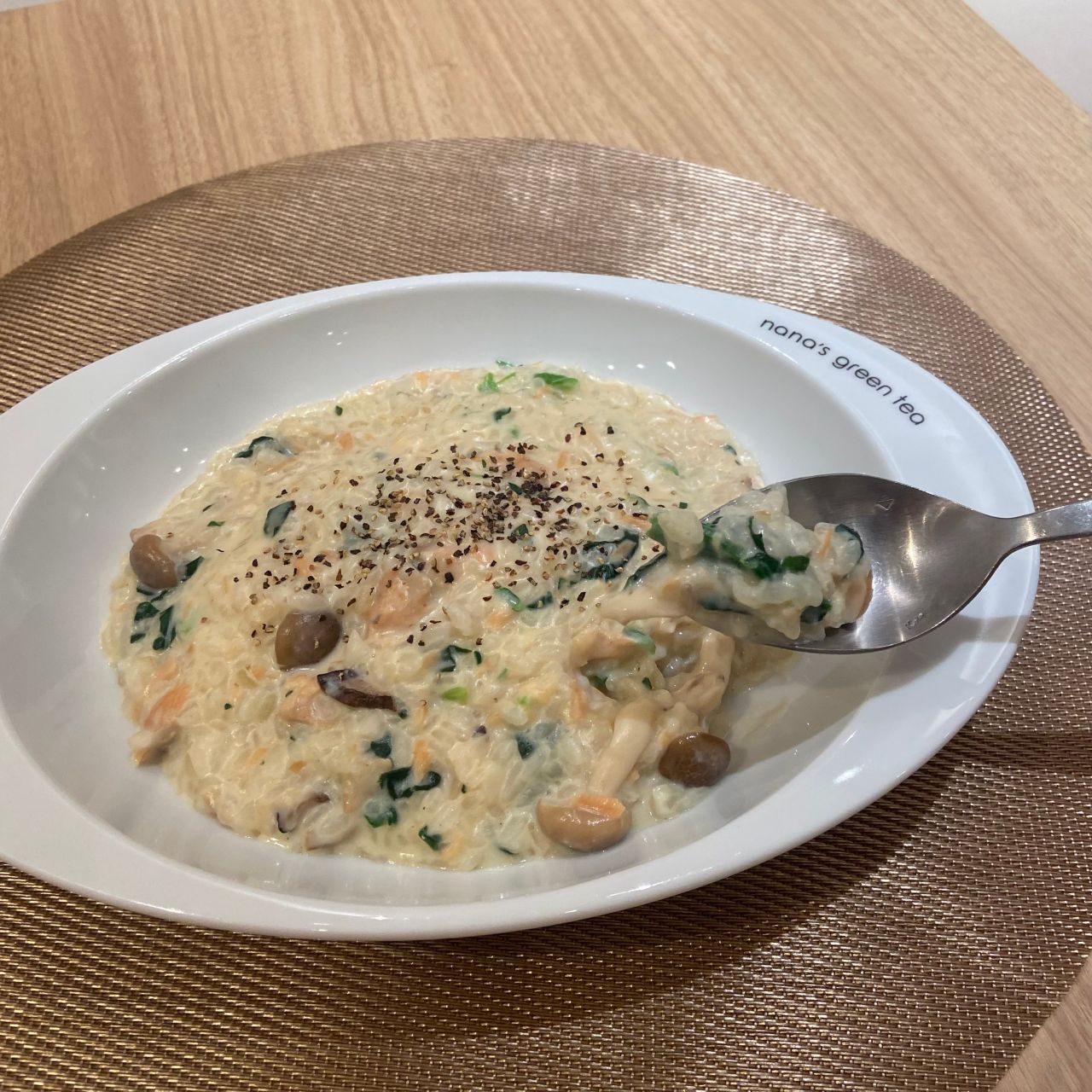 ほのかなしいたけの風味と、豆乳味噌だし、最後にチーズで炒め煮したリゾットは