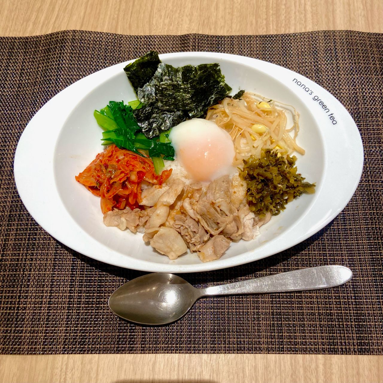 豚肉・キムチ・小松菜・のり・豆もやし・高菜・温泉卵