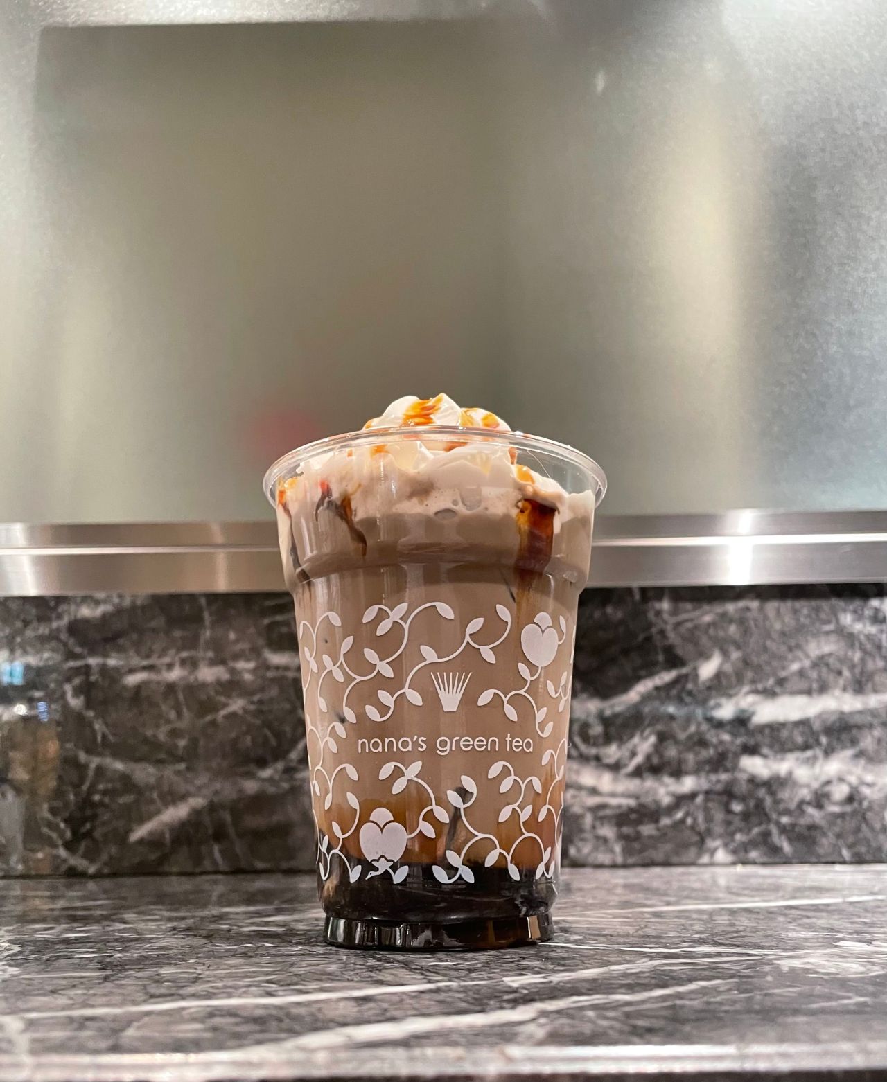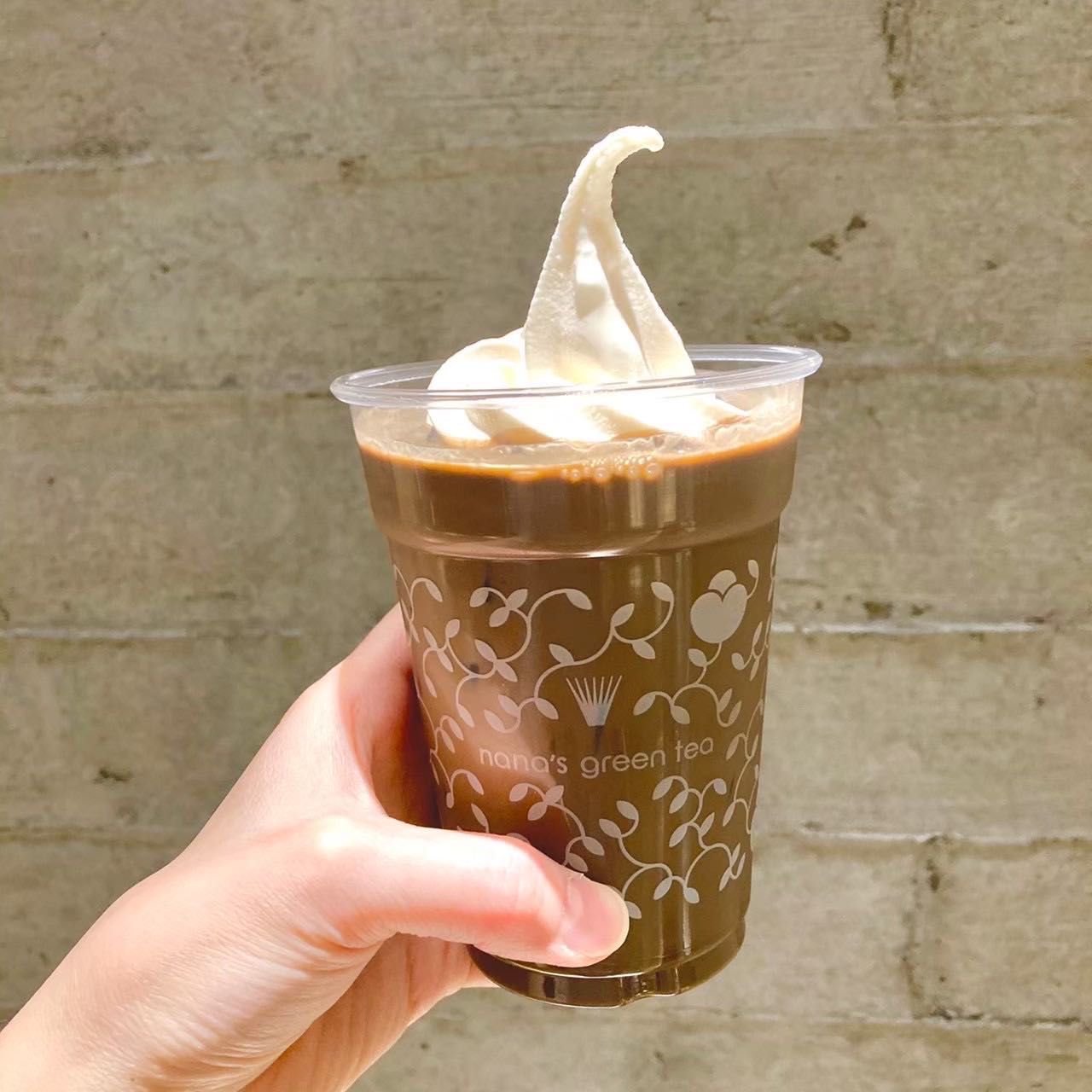 ほうじ茶ラテにミルキーなソフトクリームをトッピング。男女問わず人気のドリンク。