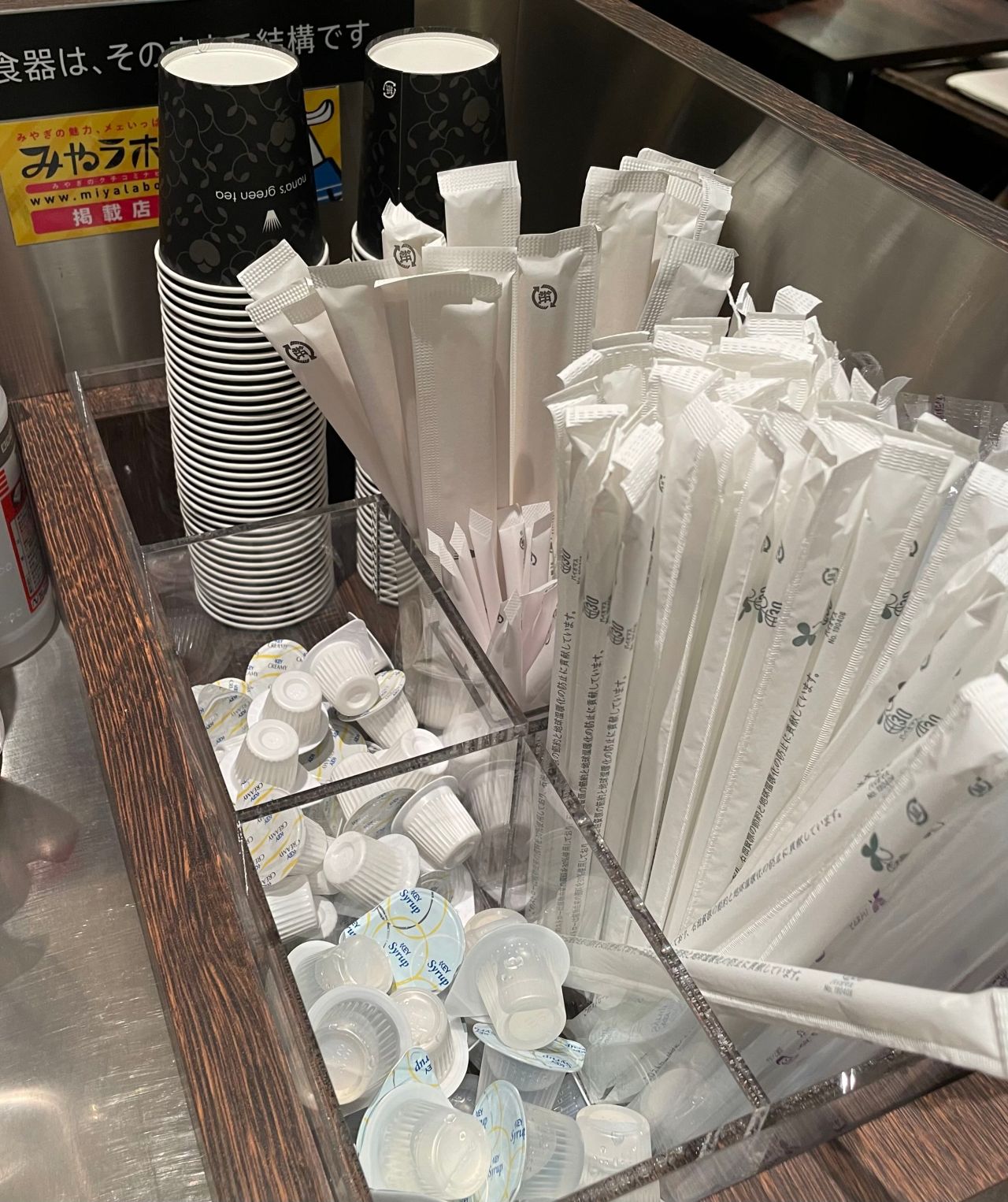 ②ストローやシロップは、中央カウンターにて、