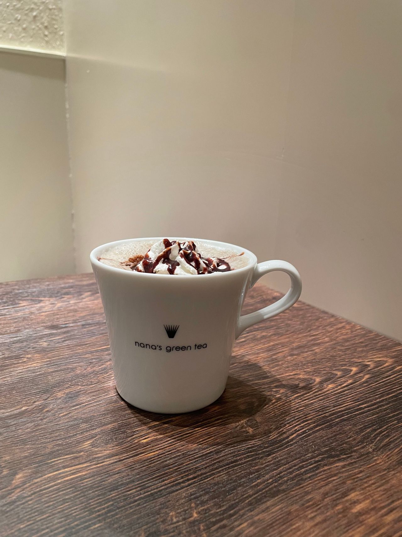 ほろ苦ほうじ茶ラテに、ふんわりホイップクリームとたっぷりチョコレートソースを。