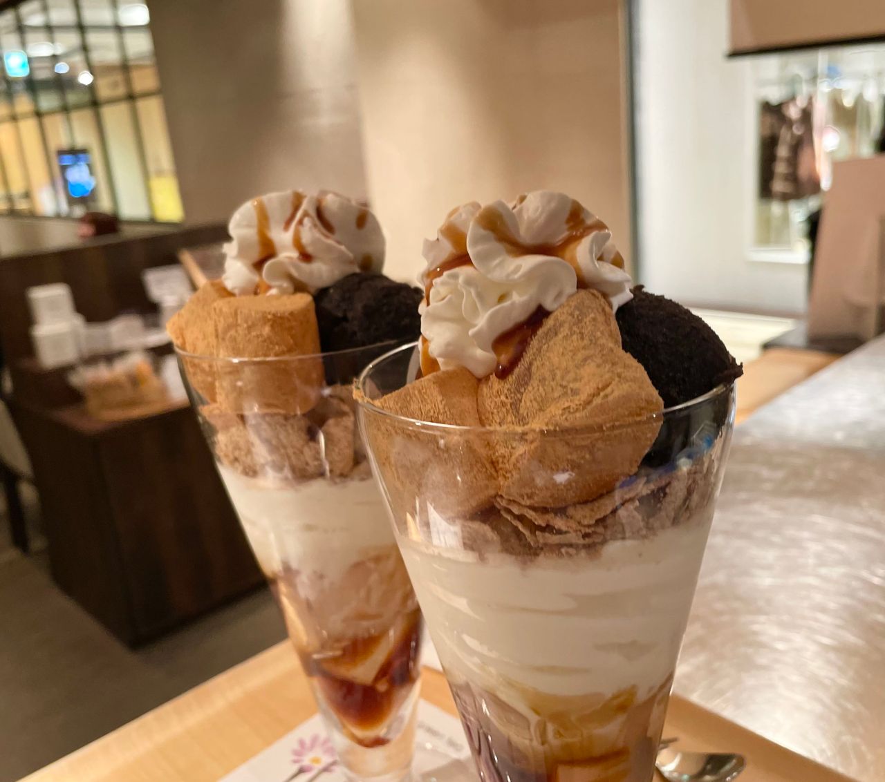 黒胡麻アイスに黒胡麻あん、そこにきな粉をまぶしたわらび餅、黒蜜、ホイップクリーム。