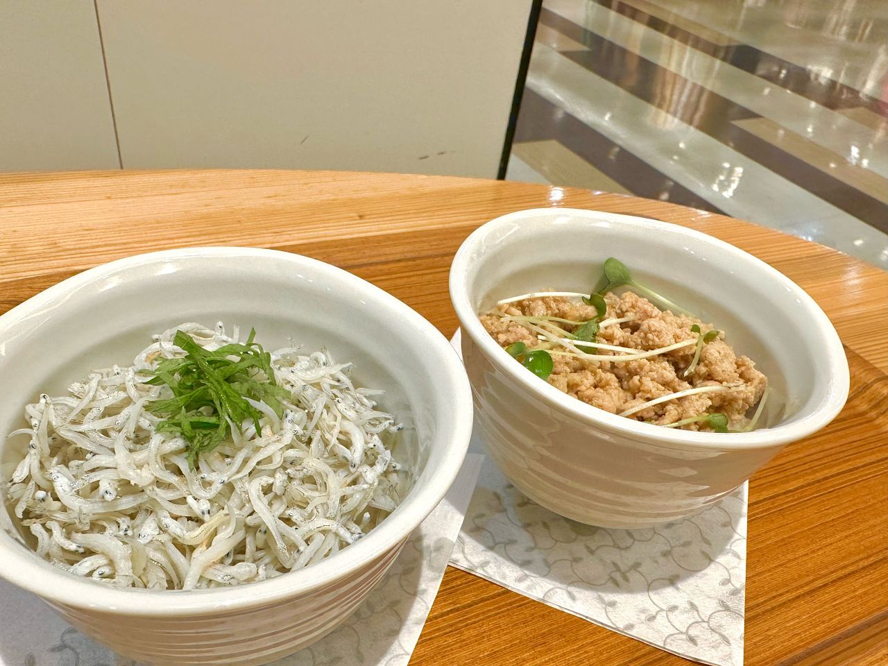 お食事では、【鶏そぼろミニどんぶり】と【しらすミニどんぶり】の二種類をご用意してます!
