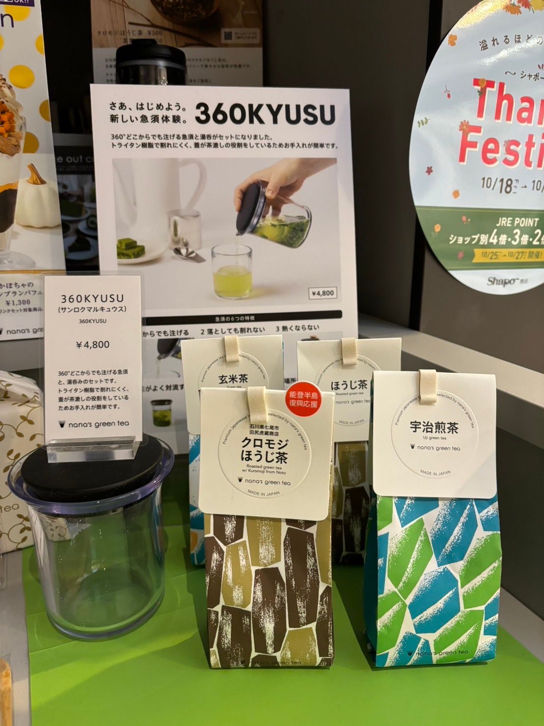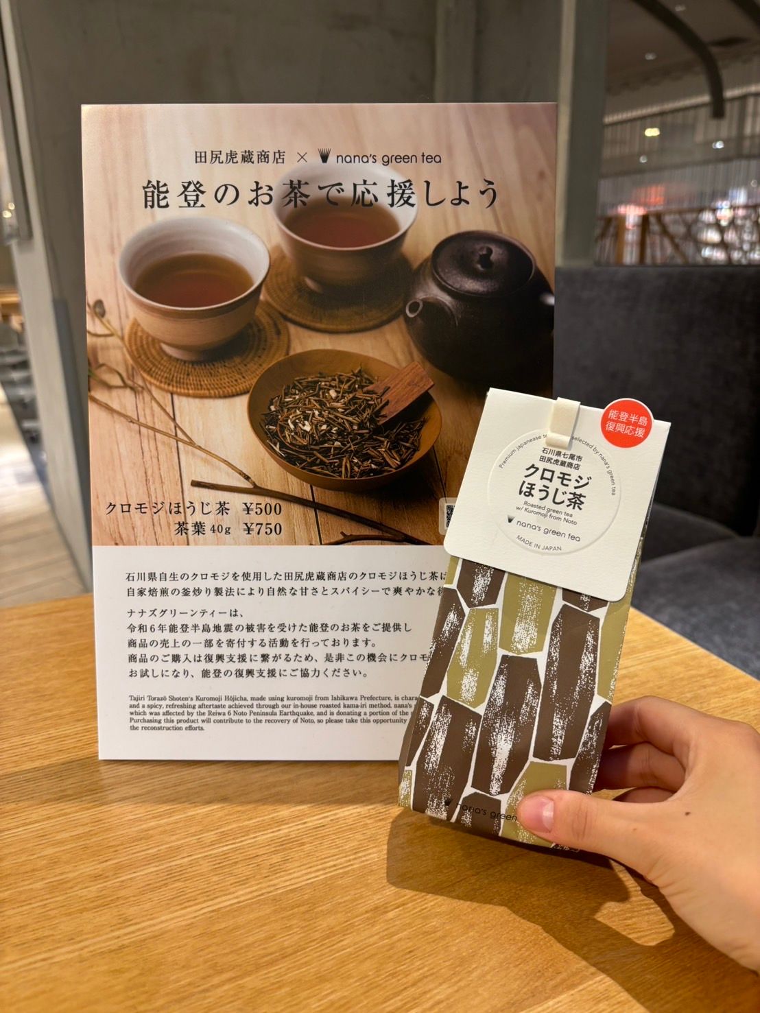 グランドメニューの4種類(宇治煎茶・ほうじ茶・玄米茶・有機(オーガニック)煎茶)に加えて、能登半島復興応援商品のクロモジほうじ茶もお求めいただけます♪