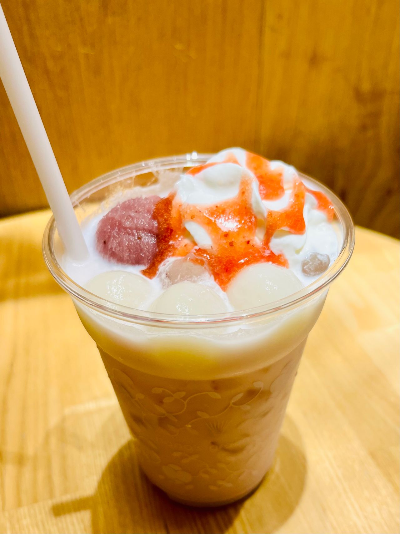 ラテの上には、イチゴあん、ふわふわのホイップクリーム