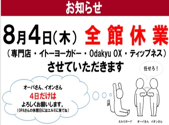 8月4日(木)は新百合ヶ丘エルミロード休館日です。