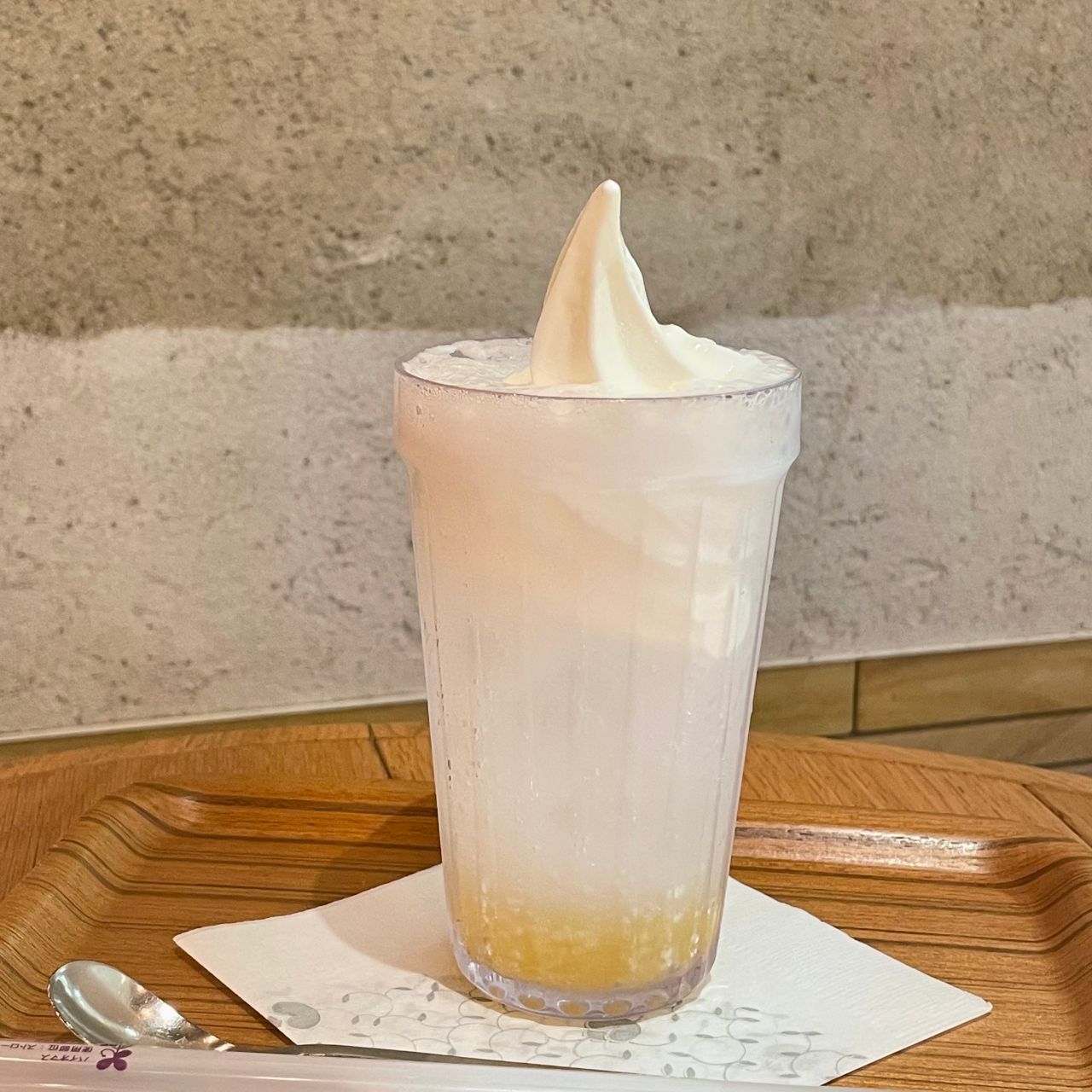 丸絞りレモンソーダに、ソフトクリームがのった商品です。