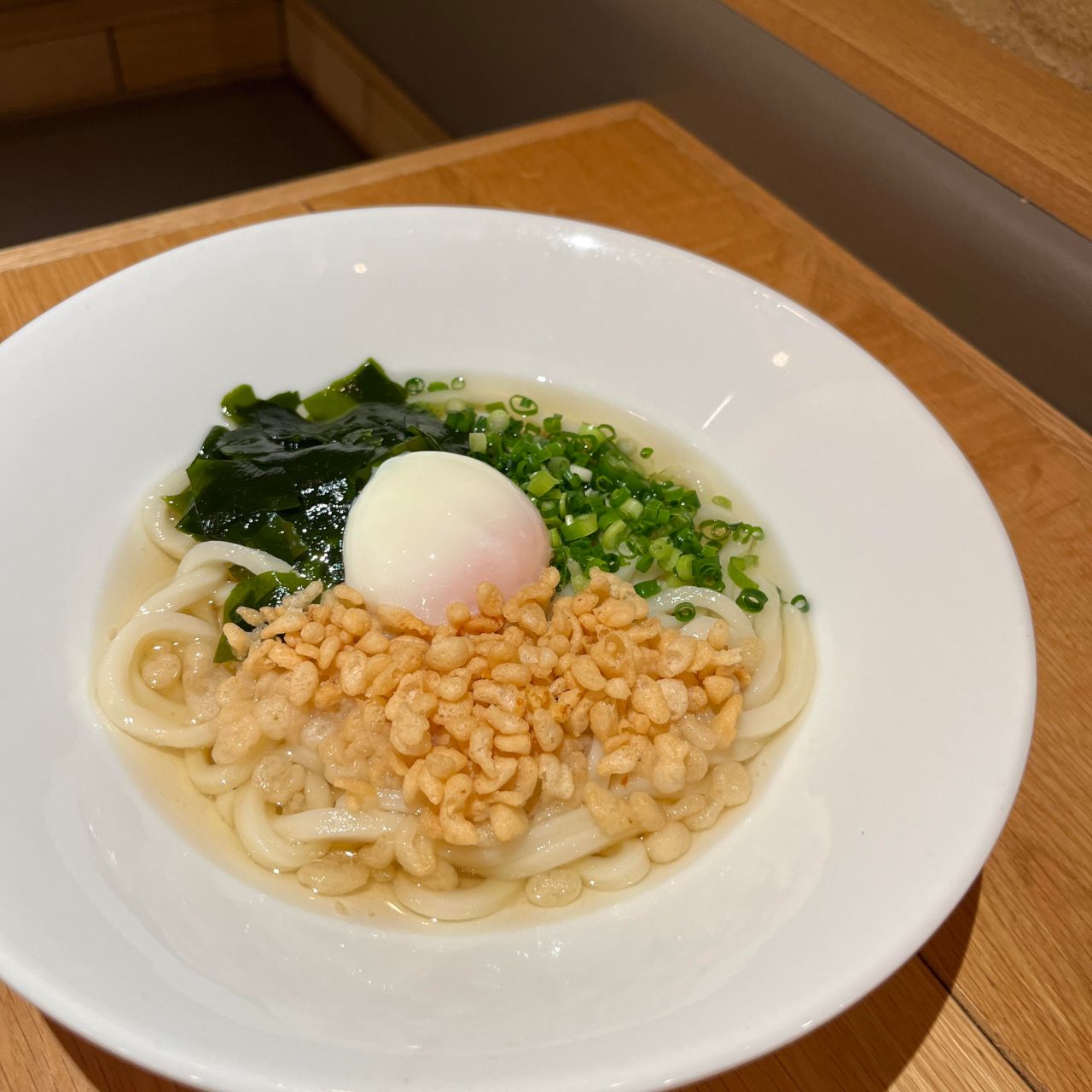 さっぱりおいしい【温泉卵たぬきうどん】です。