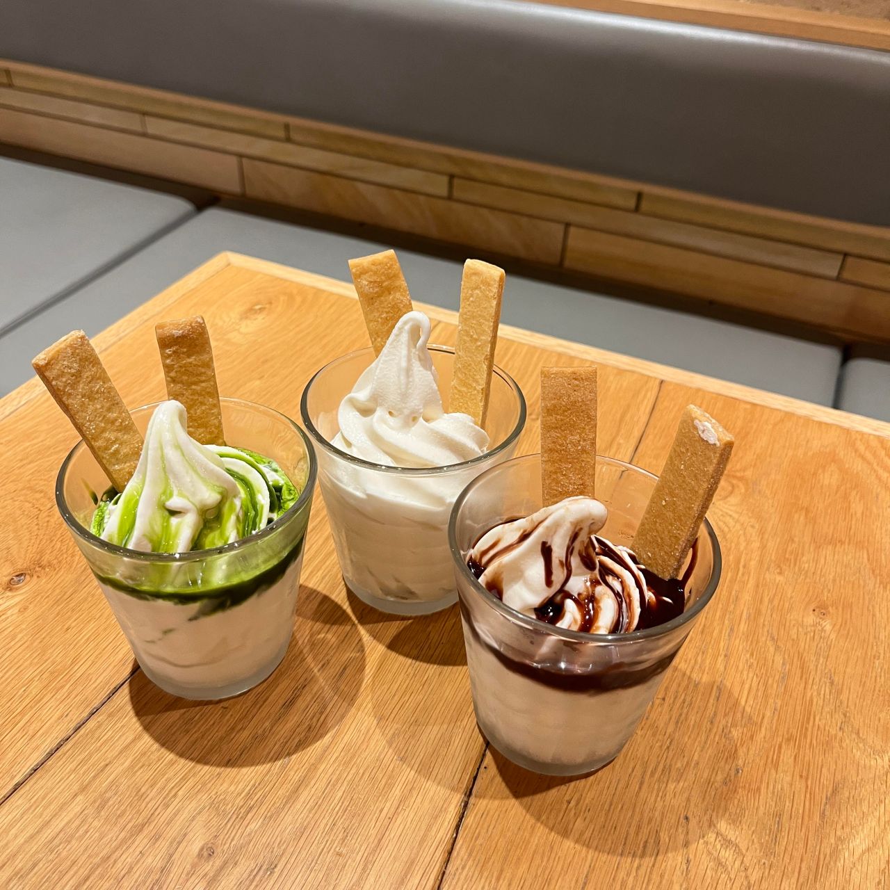 サクサクの棒パイが付いたシンプルなミルクソフト・チョコレートソース・抹茶蜜のかかった3種類のご用意がございます。