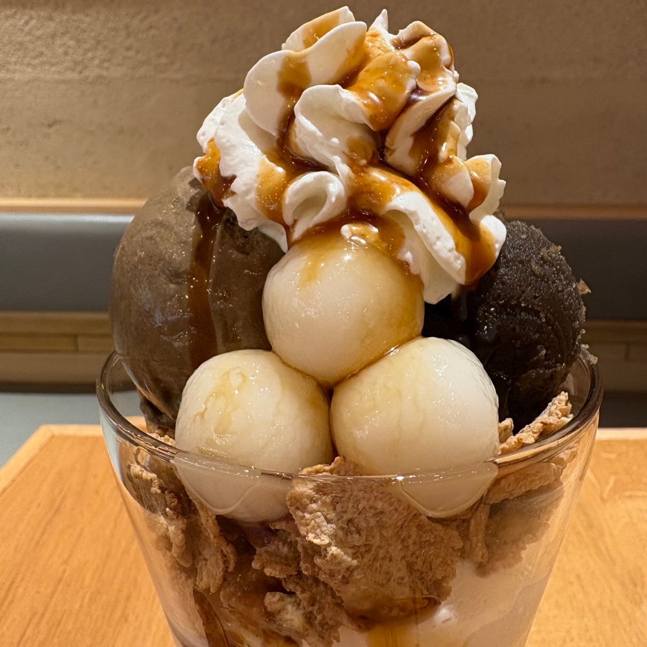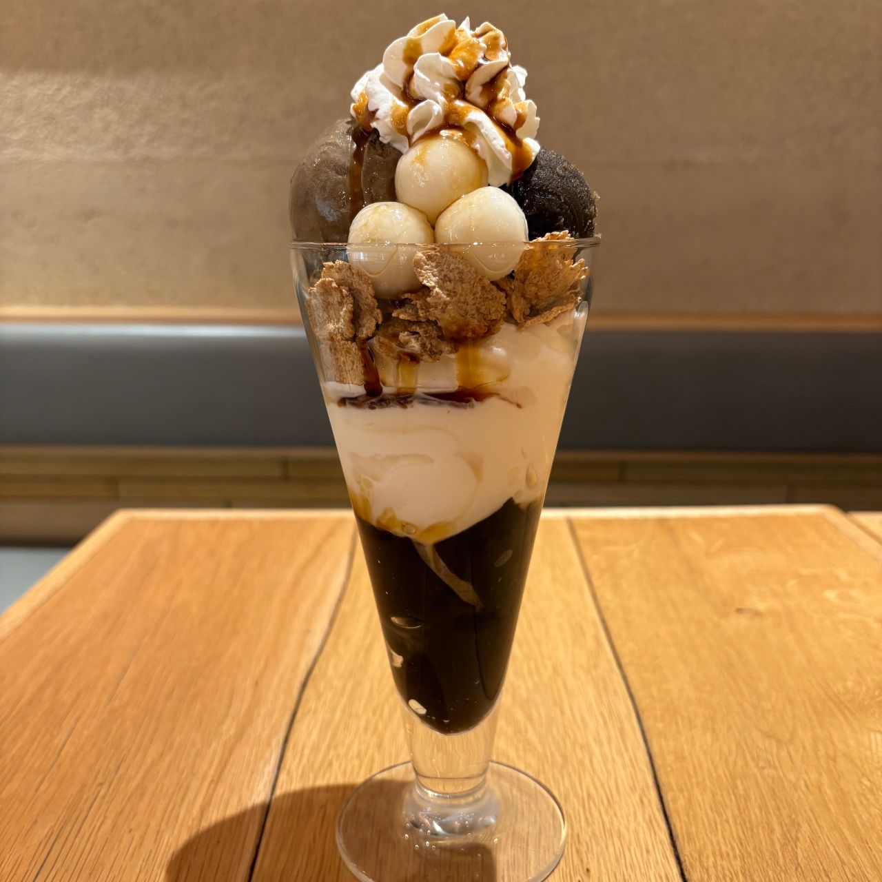 そして、玄米フレークをかぶせ、その上にほうじ茶アイス、ほうじ茶あんこ、白玉を乗せ、更にその上にホイップクリームを乗せ、黒蜜をかけたら完成です!!
